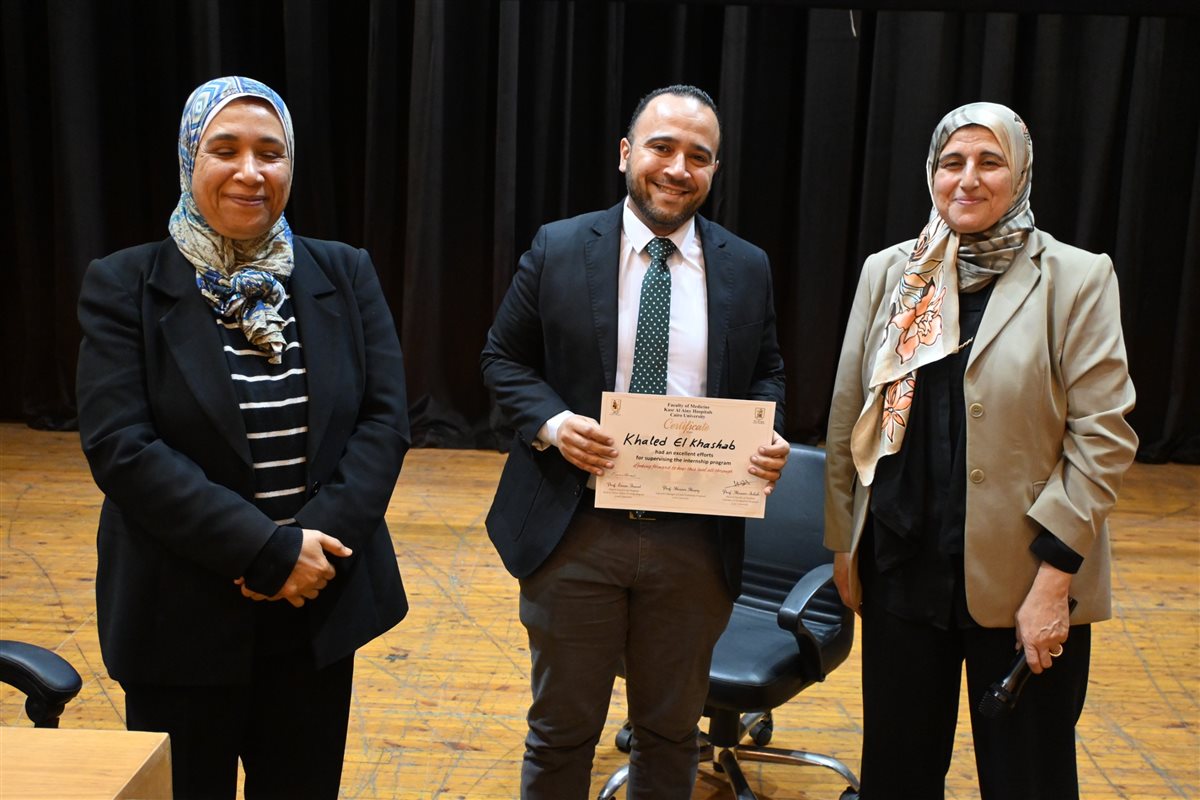 وشهد اليوم تكريم منسقي التدريب من الأساتذة الذين قاموا بالإشراف المباشر على الراوندات الإكلينيكية لأطباء الامتياز، تقديرًا لدورهم المحوري في المتابعة والتوجيه، إلى جانب تكريم عدد من أطباء الامتياز الملتزمين والمتميزين الذين كان لهم دور فعّال خلال فترة تدريبهم، في لفتة تعكس تقدير الكلية للجهد والانضباط والتميز.