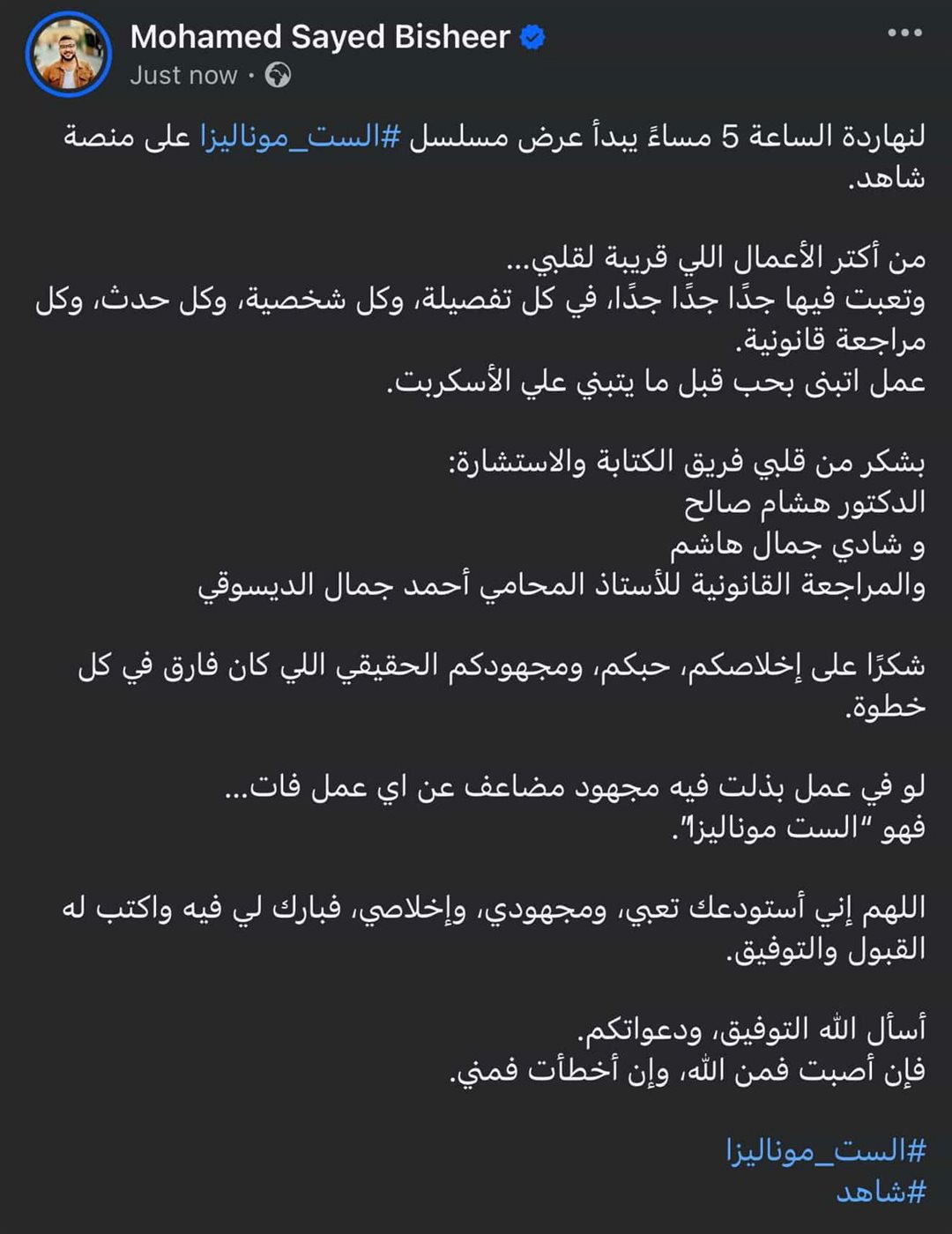 أعلن المؤلف محمد سيد بشير انطلاق عرض أولى حلقات مسلسله الجديد "الست موناليزا"، الذي تقود بطولته النجمة مي عمر، مؤكداً أن هذا العمل يمثل محطة استثنائية في مسيرته المهنية نظراً لحجم المجهود الذي بُذل في كافة تفاصيله الفنية والقانونية.