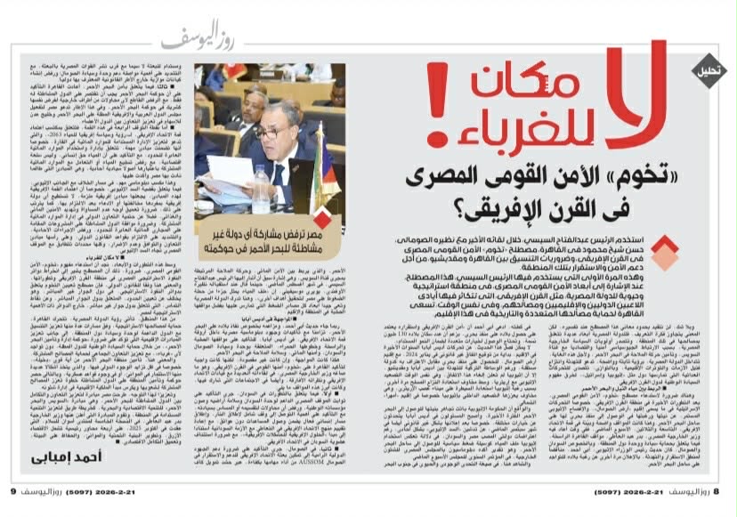 وتحت عنوان "لا مكان للغرباء" يتحدث الكاتب الصحفي أحمد إمبابي رئيس تحرير مجلة "روزاليوسف" في تحليل خاص عن الأمن القومي المصري في القرن الإفريقي مؤكدا أن مصر ترفض مشاركة أي دولة غير مشاطئة للبحر الأحمر في حوكمته.