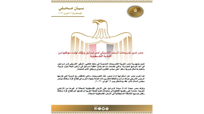 تدين جمهورية مصر العربية التصريحات المنسوبة إلى مايك هاكابي، السفير الأمريكي لدى إسرائيل، في أحد البرامج الحوارية، والتي تضمنت مزاعم بشأن أحقية إسرائيل في أراضٍ تابعة لدول عربية، باعتبارها تمثل خروجًا سافرا على مبادئ القانون الدولي وميثاق الأمم المتحدة.