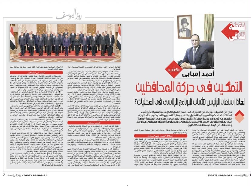 وفي مقاله “نقطة تلاقي” يتحدث الكاتب الصحفي أحمد إمبابي رئيس تحرير مجلة "روزاليوسف" عن "التمكين في حركة المحافظين" متسائلا: لماذا استعان الرئيس بشباب البرنامج الرئاسي في حركة المحافظين؟