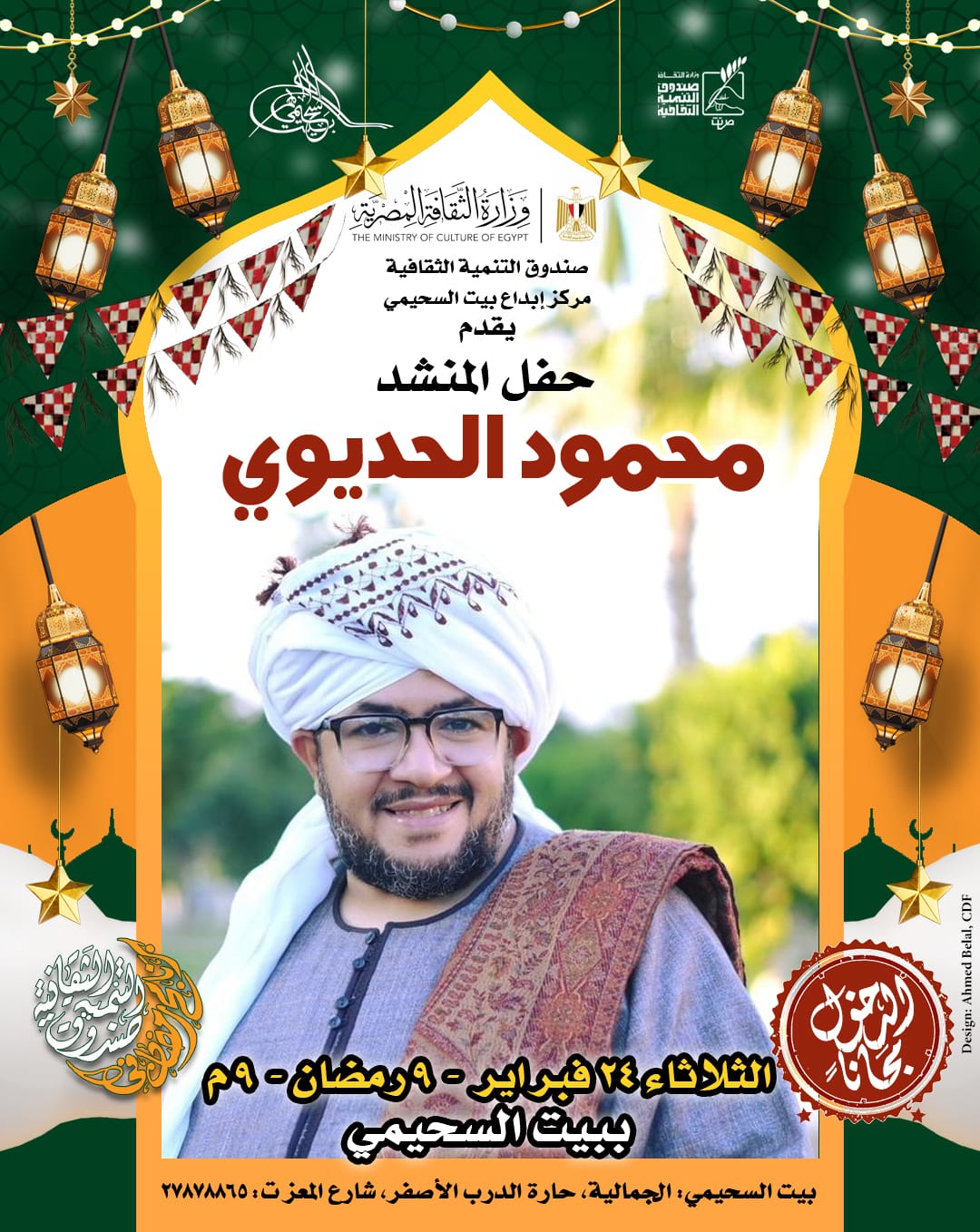 وفي بيت السحيمي، يحيي المنشد محمود الحديوي وفرقته الموسيقية حفلاً للإنشاد الديني، حيث يعد "الحديوي" أحد أبرز وجوه فن المديح النبوي في مصر، وله حضور بارز في صعيد البلاد.