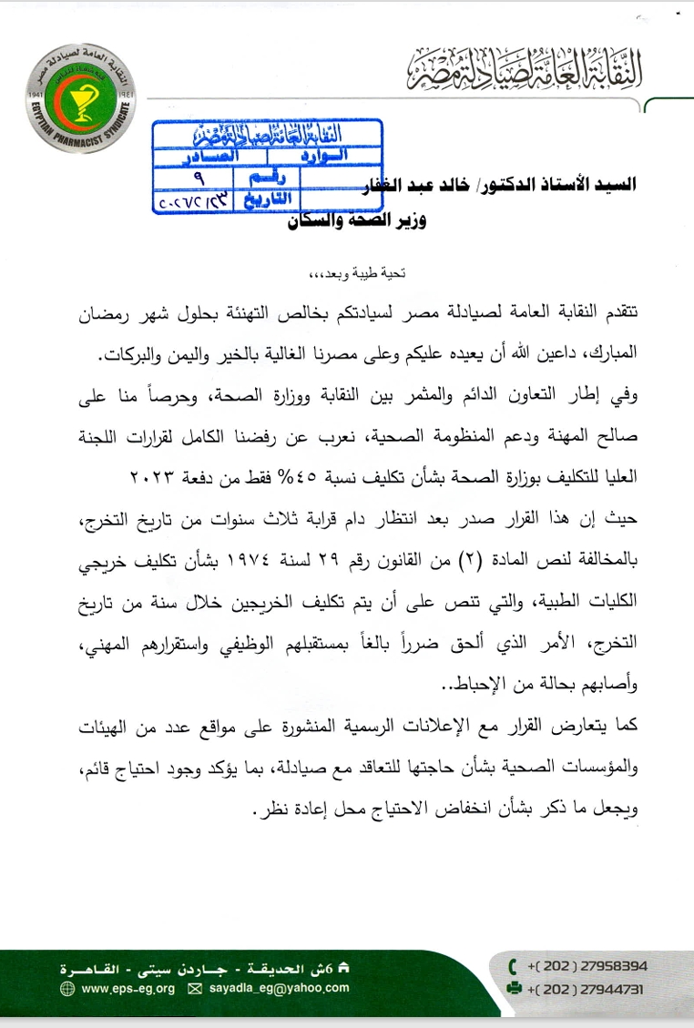 وأكدت النقابة في خطابها على رفضها الكامل لقرارات اللجنة العليا للتكليف بوزارة الصحة بشأن تكليف نسبة 45% فقط من الصيادلة دفعة 2023، حيث إن هذا القرار صدر بعد انتظار دام قرابة ثلاث سنوات من تاريخ التخرج، بالمخالفة لنص المادة (2) من القانون رقم 29 لسنة 1974 بشأن تكليف خريجي الكليات الطبية، والتي تنص على أن يتم تكليف الخريجين خلال سنة من تاريخ التخرج، الأمر الذي ألحق ضرراً بالغاً بمستقبلهم الوظيفي واستقرارهم المهني، وأصابهم بحالة من الإحباط.