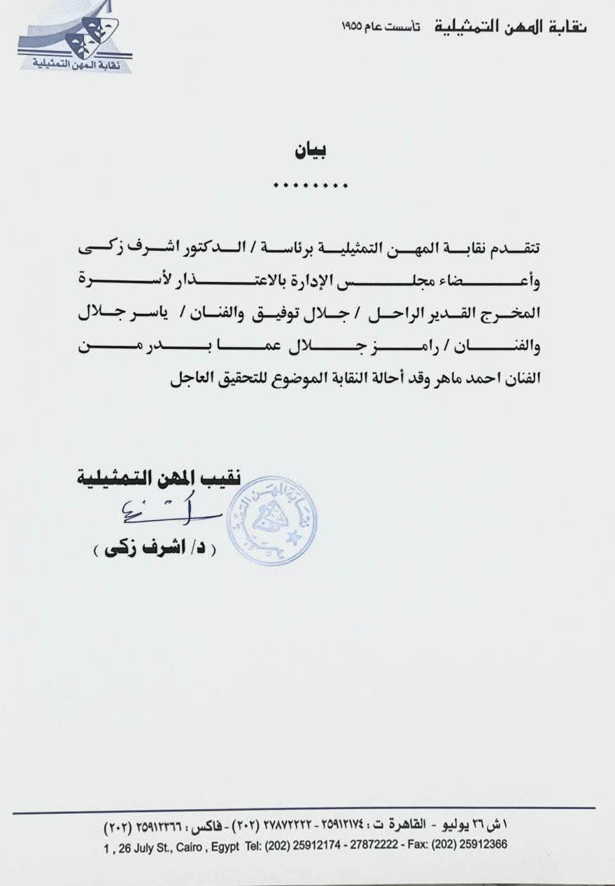 أصدرت نقابة المهن التمثيلية برئاسة الدكتور أشرف زكي بيان رسمياً تعرب فيه عن اعتذارها وتقدير الكامل لأسرة المخرج الكبير الراحل جلال توفيق وذلك علي خلفية التصريحات الأخيرة التي أدلي بها الفنان أحمد ماهر.