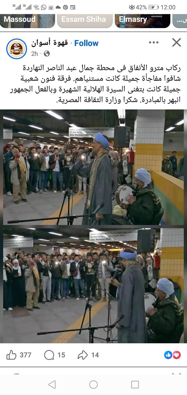 لاقت مبادرة وزارة الثقافة لدمج الفنون في الفضاءات العامة اهتمامًا كبيرًا من الجمهور وتفاعلًا واسعًا على مواقع التواصل الاجتماعي، خاصة مع انطلاق المبادرة أمس بعروض حيّة للسيرة الهلالية في محطة جمال عبد الناصر بمترو الأنفاق، تحت رعاية الدكتورة جيهان زكي، وزيرة الثقافة، والفريق كامل الوزيري، وزير النقل.