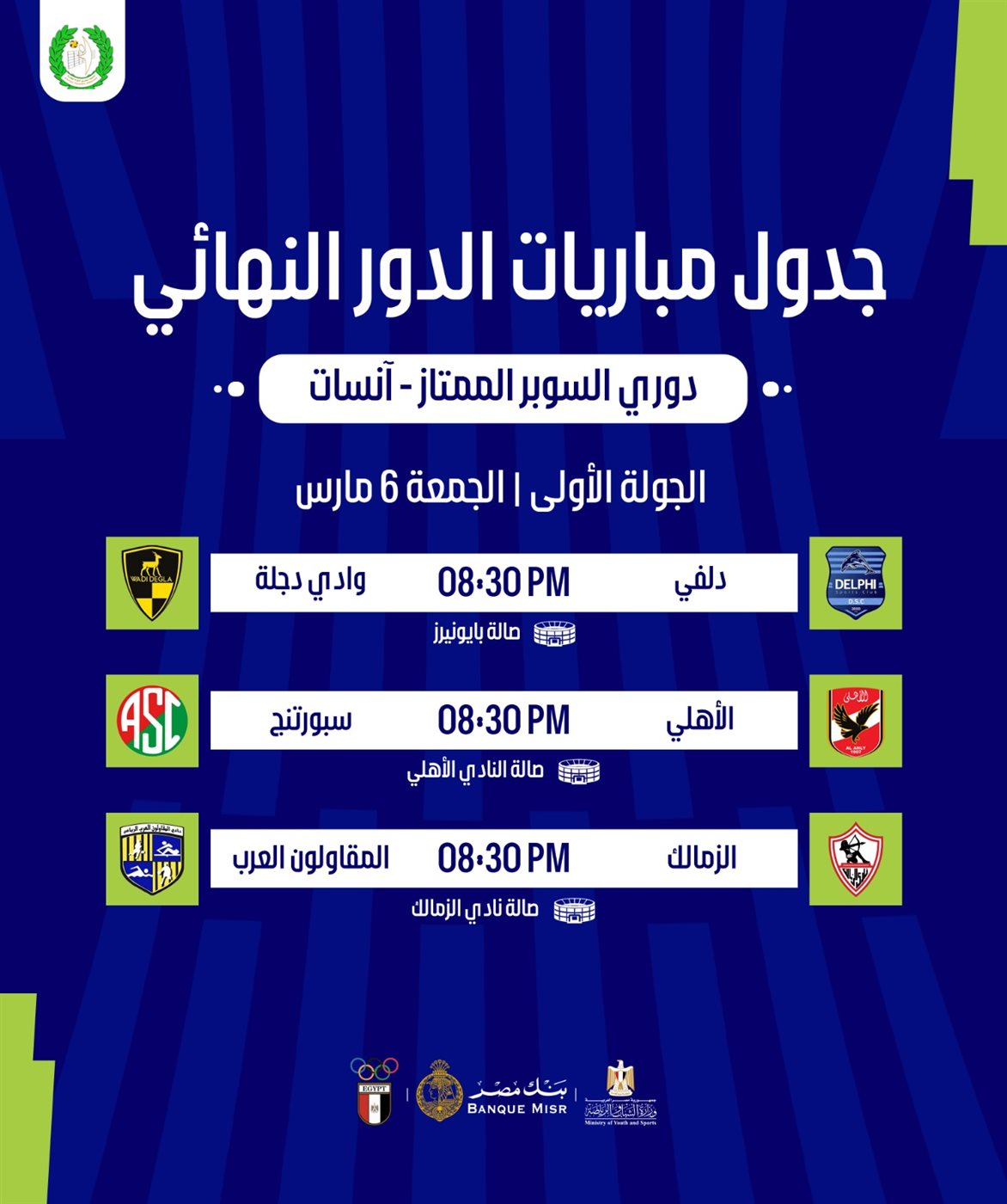 صالة نادي المقاولون العرب – 6:00 مساءً