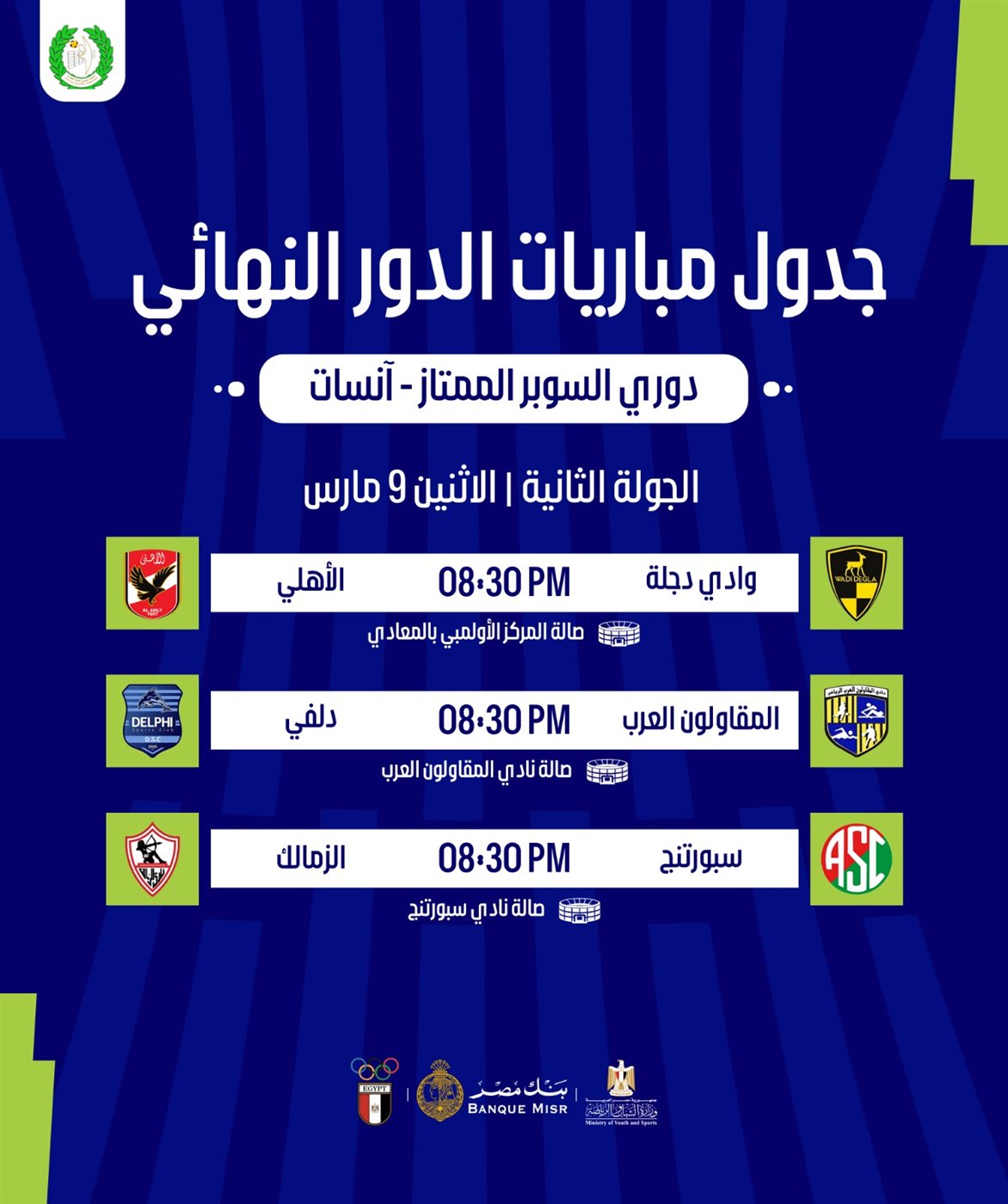 صالة نادي المقاولون العرب – 8:30 مساءً
