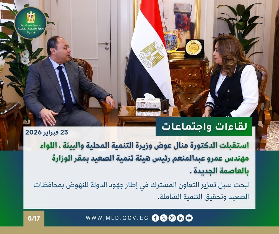 استقبلت الدكتورة منال عوض وزيرة التنمية المحلية والبيئة، اللواء عمرو عبد المنعم رئيس هيئة تنمية الصعيد لبحث سبل تعزيز التعاون المشترك في إطار جهود الدولة للنهوض بمحافظات الصعيد وتحقيق التنمية الشاملة.