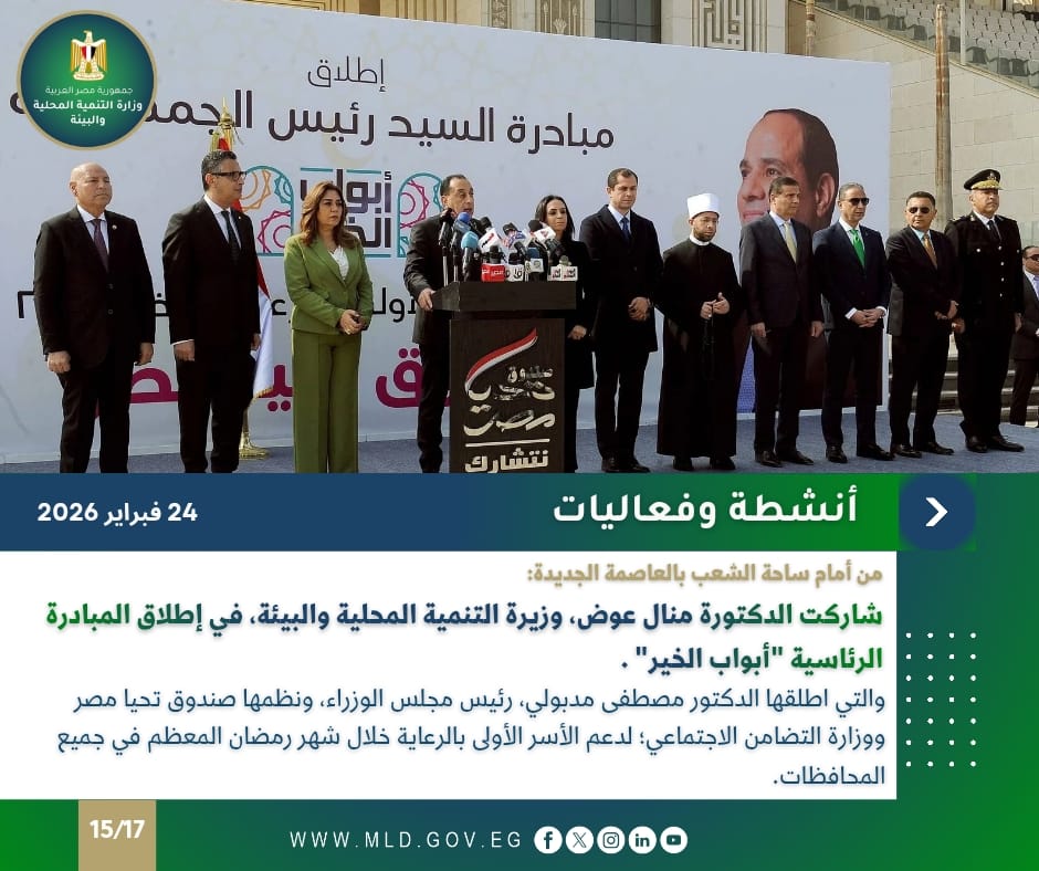 شاركت الدكتورة منال عوض وزيرة التنمية المحلية والبيئة، في إطلاق مبادرة الرئيس عبدالفتاح السيسي، رئيس الجمهورية "أبواب الخير"، والتي أطلقها الدكتور مصطفى مدبولي، رئيس مجلس الوزراء، من أمام ساحة الشعب بالعاصمة الجديدة؛ ونظمها صندوق تحيا مصر ووزارة التضامن الاجتماعي؛ لدعم الأسر الأولى بالرعاية خلال شهر رمضان المعظم في جميع المحافظات.