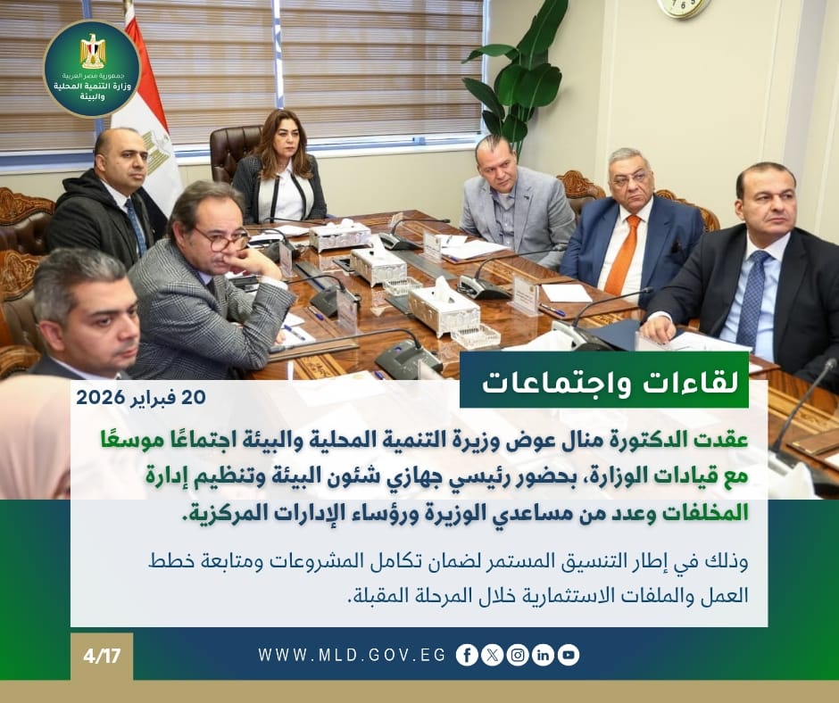 كما عقدت الدكتورة منال عوض وزيرة التنمية المحلية والبيئة، اجتماعًا موسعًا مع قيادات الوزارة، بحضور رئيسي جهازي شئون البيئة وتنظيم إدارة المخلفات وعدد من مساعدي الوزيرة ورؤساء الإدارات المركزية، وذلك في إطار التنسيق المستمر لضمان تكامل المشروعات ومتابعة خطط العمل والملفات الاستثمارية خلال المرحلة المقبلة.