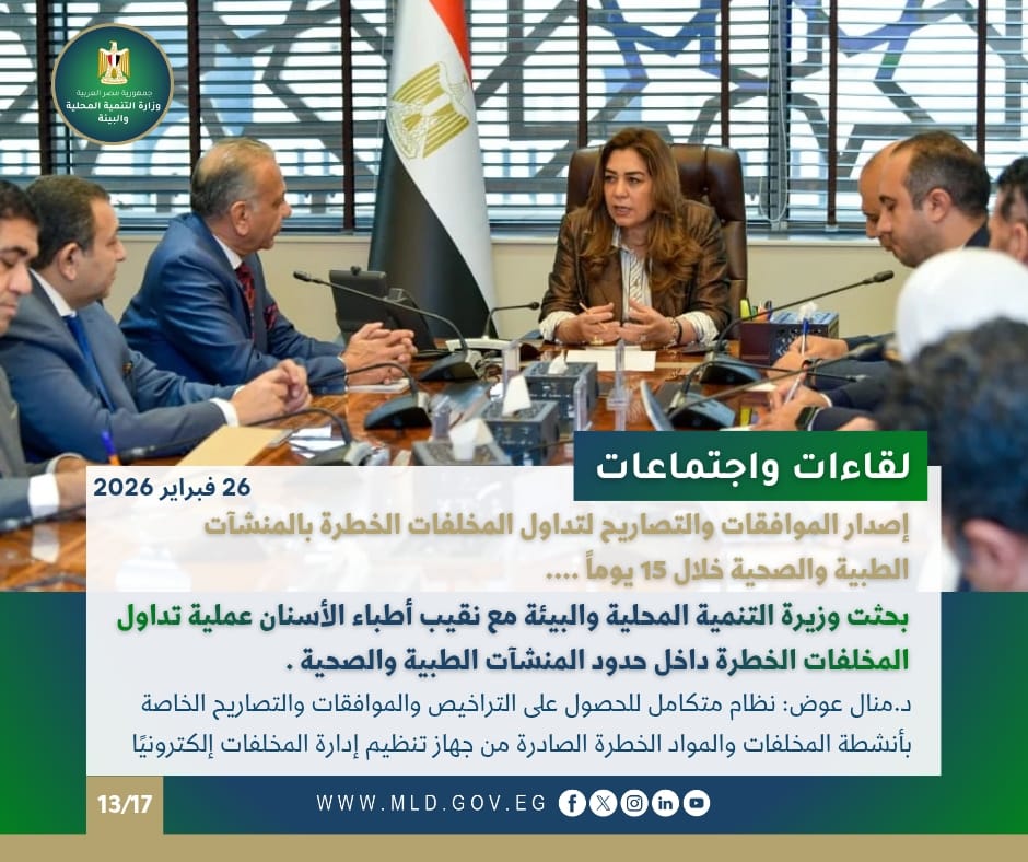 عقدت الدكتورة منال عوض وزيرة التنمية المحلية والبيئة، اجتماعًا لبحث عملية تداول المخلفات الخطرة داخل حدود المنشآت الطبية والصحية سواء بالمستشفيات أو المعامل والعيادات الخاصة أو المراكز التشخيصية، وذلك بحضور الأستاذ ياسر عبدالله، رئيس جهاز تنظيم إدارة المخلفات، الدكتور إيهاب هيكل نقيب أطباء الأسنان، الدكتور وليد حسن، نقيب أطباء أسنان القاهرة، الدكتور محمد علاء الدين مدرس جراحة الوجه والفكين كلية طب الأسنان جامعة الأزهر، وذلك بمقر الوزارة بالعاصمة الجديدة.