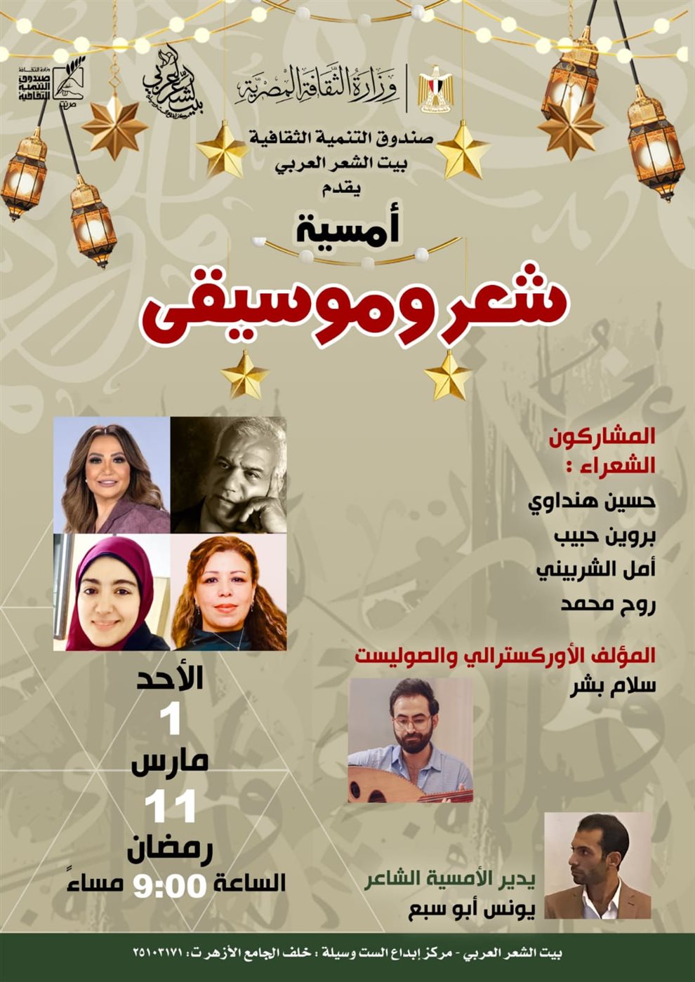 ويقدم بيت الشعر العربي "بيت الست وسيلة" خلف الجامع الأزهر أمسية بعنوان "أمسية شعر وموسيقى"، تجمع بين الإلقاء الشعري والمصاحبة الموسيقية في أجواء رمضانية تحتفي بجماليات الكلمة والإيقاع.
