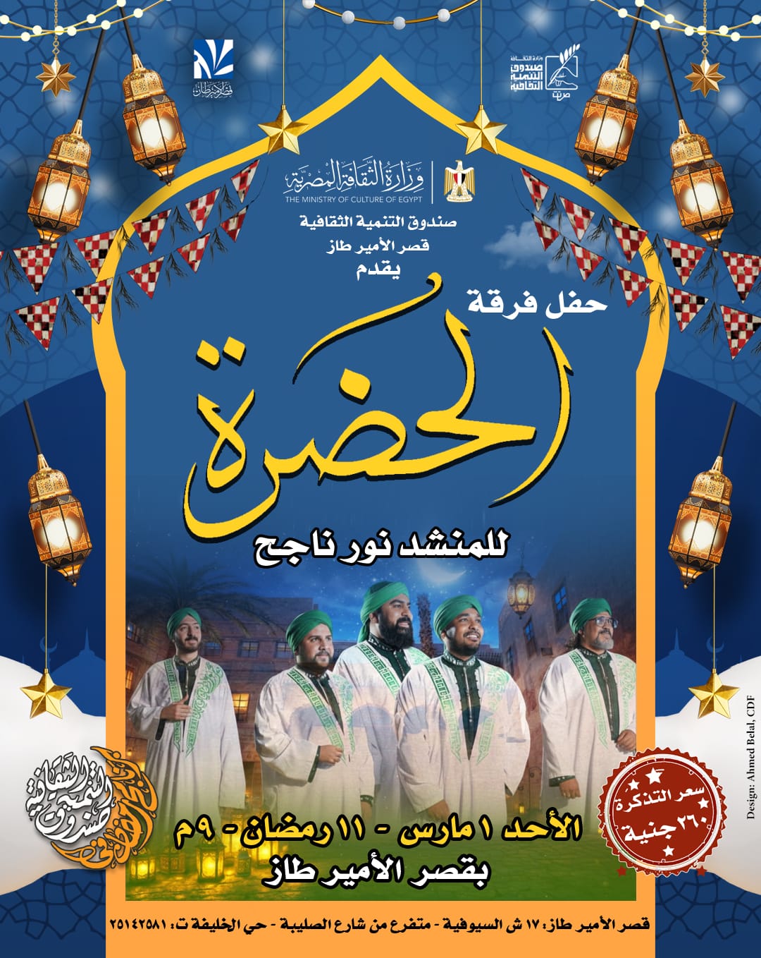 ويستضيف مركز إبداع قصر الأمير طاز بشارع السيوفية حفل فرقة الحضرة بقيادة الفنان نور ناجح، حيث تقدم الفرقة تراث الحضرات الصوفية المصرية في صياغة فنية حديثة تمزج بين الإنشاد الروحي والتوزيع الموسيقي المعاصر.