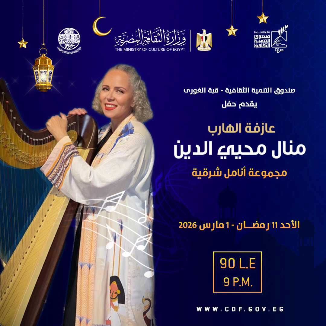 ففي مركز إبداع قبة الغوري بشارع الأزهر، يُقام حفل للفنانة منال محيى الدين وفرقتها الموسيقية أنامل شرقية، حيث تقدم تجربة موسيقية مميزة تقوم على توظيف آلة الهارب في قالب موسيقي معاصر، عبر صياغات تجمع بين الحس الشرقي والرؤية الموسيقية الحديثة.