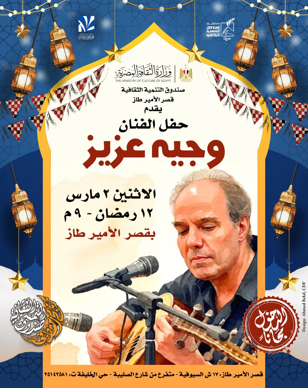 ففي مركز إبداع قصر الأمير طاز، يحيي الفنان وجيه عزيز حفلًا غنائيًا بمصاحبة فرقته الموسيقية، حيث اشتهر بتقديم أغانٍ ذات طابع شرقي أصيل برؤية معاصرة، متأثرًا بتجارب فنية راسخة مثل سيد درويش وصلاح جاهين، بدأ عزيز مسيرته الفنية في ثمانينيات القرن الماضي، وقدم أعمالًا عبّرت عن نبض الشارع المصري، وأصدر عددًا من الألبومات البارزة من بينها «بالليل» (1997)، كما تعاون مع عدد من كبار الفنانين، منهم محمد منير، مقدمًا تجربة غنائية مستقلة بعيدة عن السائد التجاري، ترتكز على الحس المصري الأصيل.