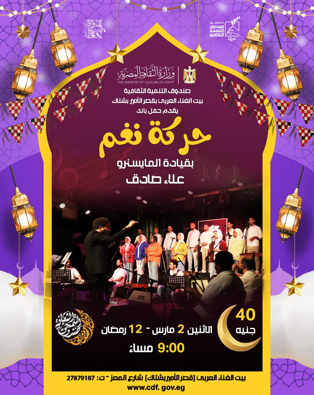 ضمن خطة نشاط وزارة الثقافة، وتحت رعاية الدكتورة جيهان زكى وزيرة الثقافة، يواصل قطاع صندوق التنمية الثقافية برئاسة المعمارى حمدى السطوحى، تقديم برنامجه الثقافي والفني احتفالًا بشهر رمضان المبارك، حيث تُقام مساء الاثنين 2 مارس 2026 الموافق 12 رمضان مجموعة من الفعاليات الفنية والثقافية المتنوعة بمراكز الإبداع التابعة له.