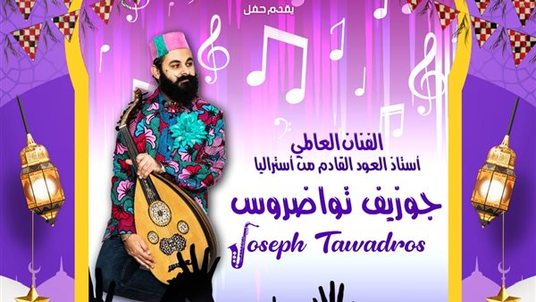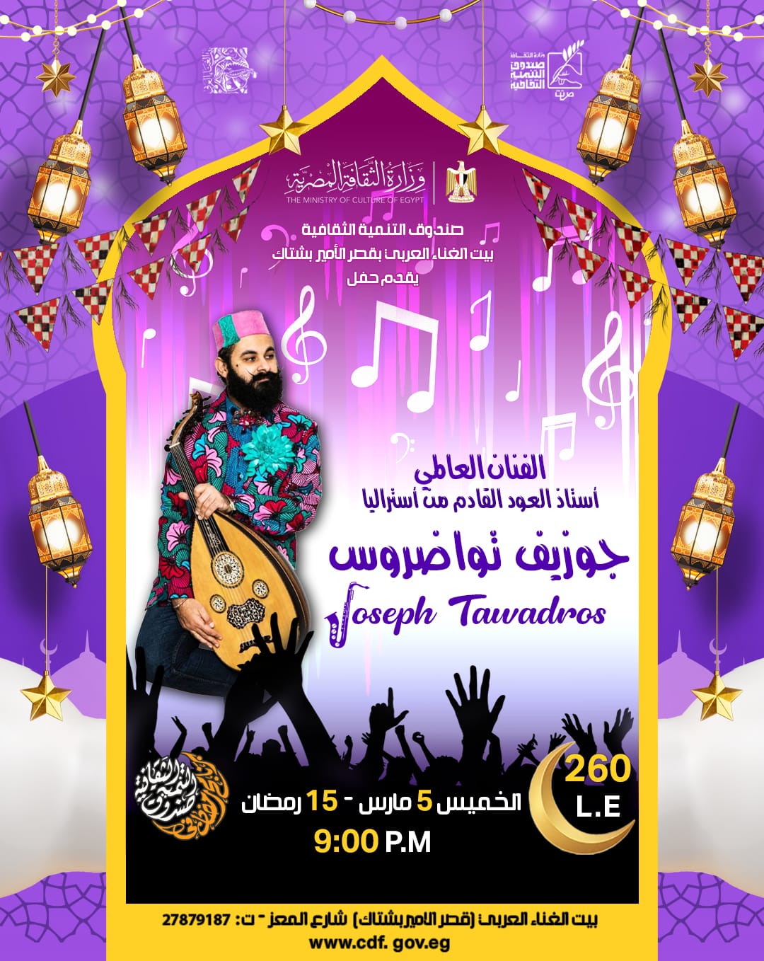 ضمن خطة نشاط وزارة الثقافة، وتحت رعاية الدكتورة جيهان زكى وزيرة الثقافة، يستضيف بيت الغناء العربي بقصر الأمير بشتاك، بشارع المعز لدين الله الفاطمي، الفنان العالمي وعازف العود جوزيف تواضروس، في التاسعة مساء الخميس 5 مارس الموافق 15 رمضان، ضمن فعاليات ليالي رمضان الثقافية التي ينظمها صندوق التنمية الثقافية.