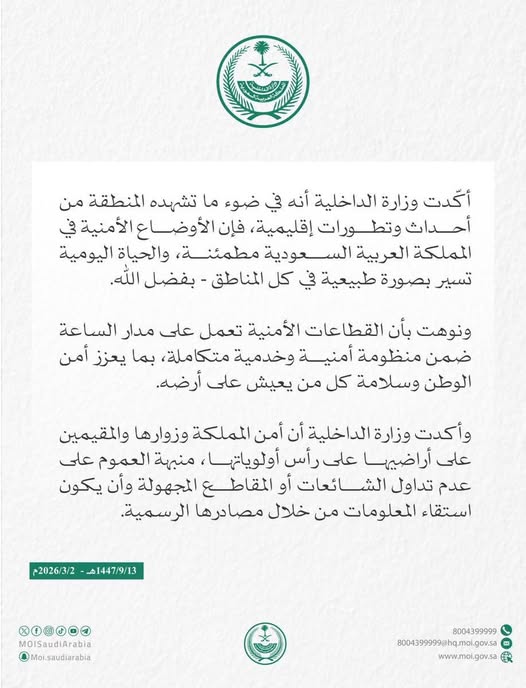 أكّدت وزارة الداخلية السعودية أنه في ضوء ما تشهده المنطقة من أحداث وتطورات إقليمية، فإن الأوضاع الأمنية في المملكة العربية السعودية مطمئنة، والحياة اليومية تسير بصورة طبيعية في كل المناطق.