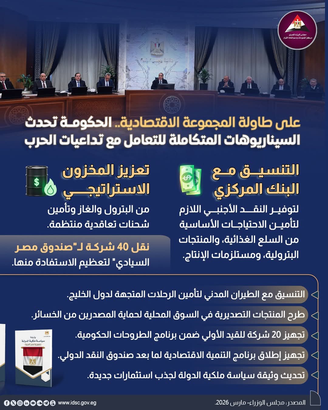 نشر مركز المعلومات ودعم اتخاذ القرار التابع لمجلس الوزراء انفوجرافيك يوضح أبرز السيناريوهات المتوقعة في ظل التطورات الأخيرة بين الولايات المتحدة الأمريكية وإسرائيل من جهة، وإيران من جهة أخرى، وذلك في إطار الاستعدادات الحكومية لمواجهة تداعيات هذه الأزمة.