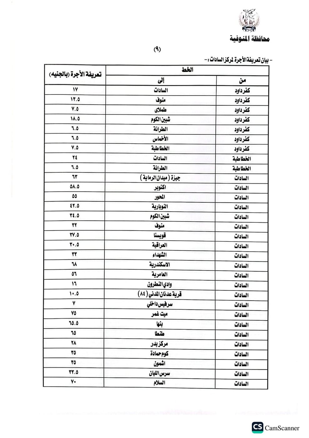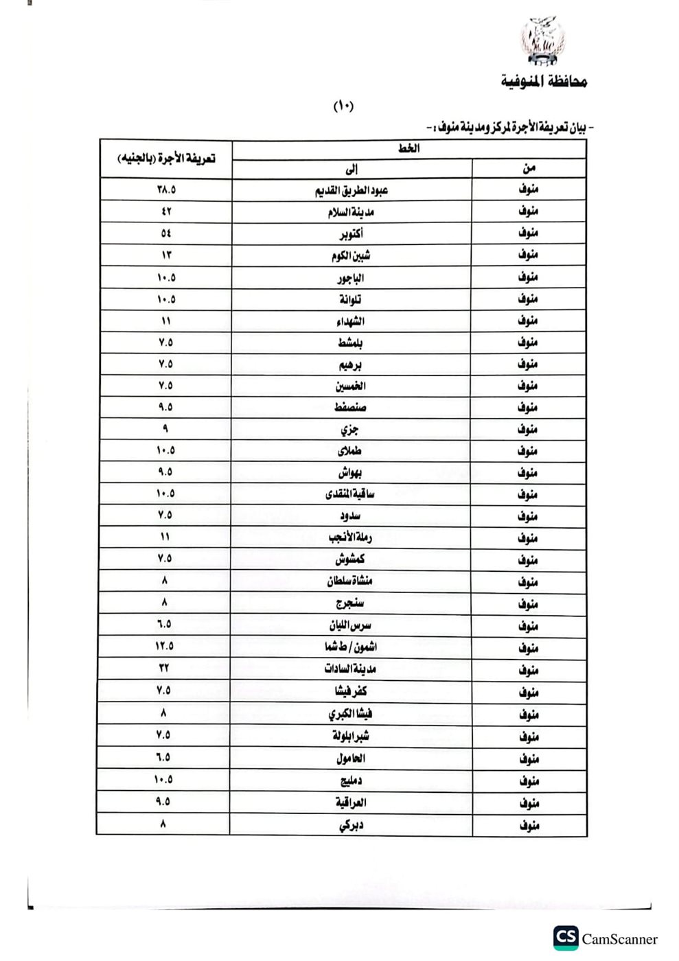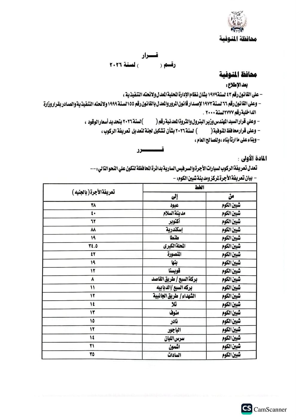أصدر اليوم اللواء عمرو الغريب محافظ المنوفية قرارا بشأن تعديل التعريفة الجديدة والمقررة لركوب سيارات الأجرة والسرفيس والتاكسي والتوك توك بدائرة المحافظة، وذلك عقب قرار لجنة التسعير التلقائي للمنتجات البترولية وزيادة أسعار البنزين والسولار، اعتبارا من اليوم الثلاثاء الموافق ١٠ مارس٢٠٢٦، جاء ذلك خلال اجتماع بحضور محمد موسى نائب المحافظ والمحاسب خالد النمر السكرتير العام المساعد والعقيد مصطفى الضبع وكيل إدارة المرور والعقيد هيثم النطاط مدير مباحث المرور وأسامة عز الدين وكيل وزارة التموين والعقيد محمد فتحي مدير مشروع المواقف.