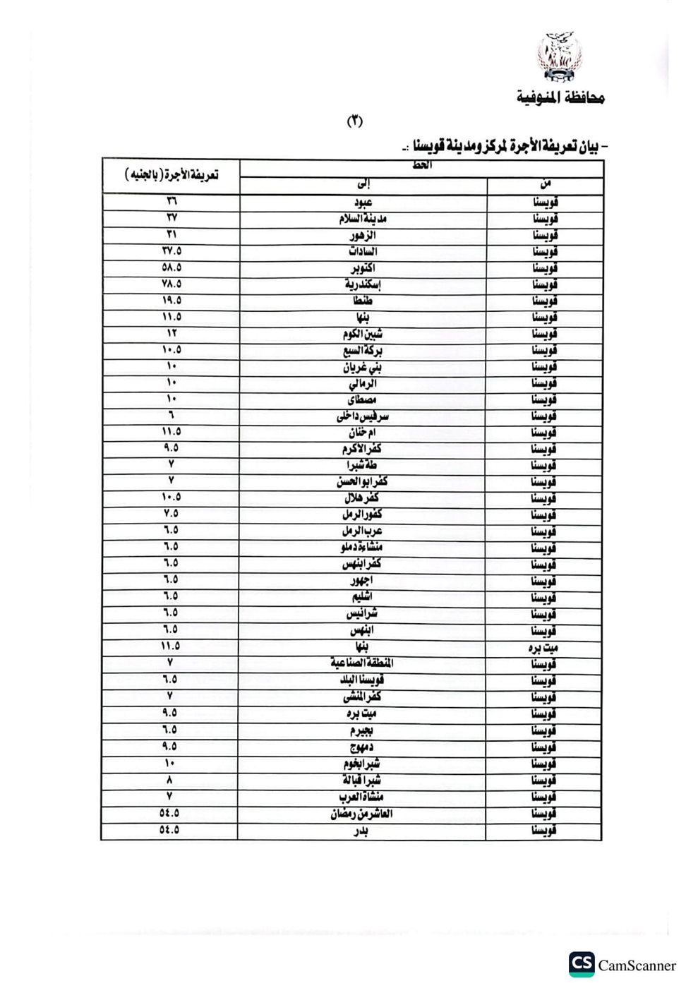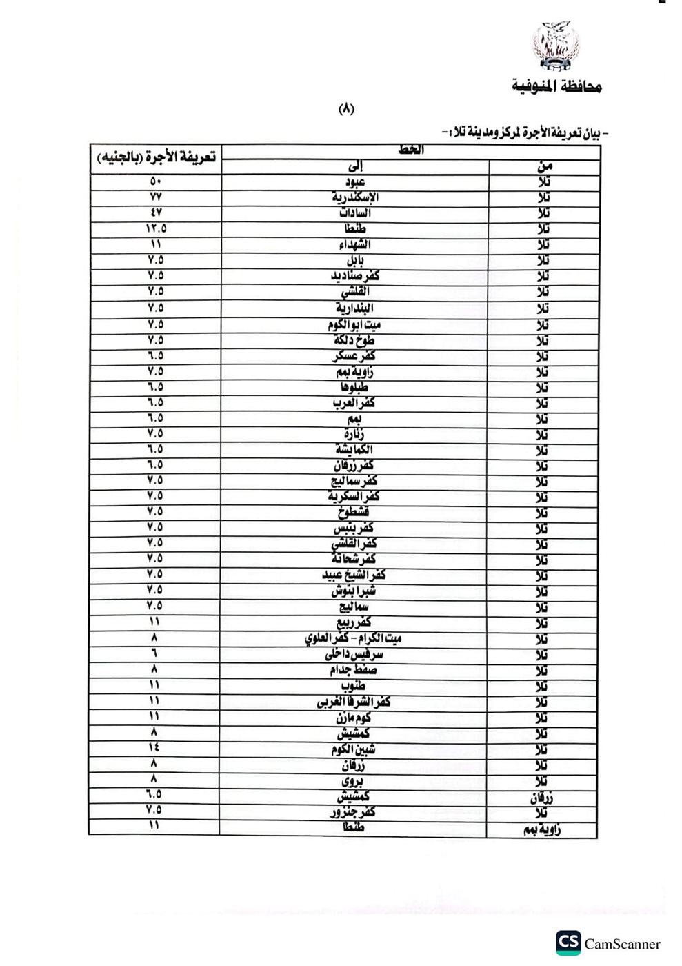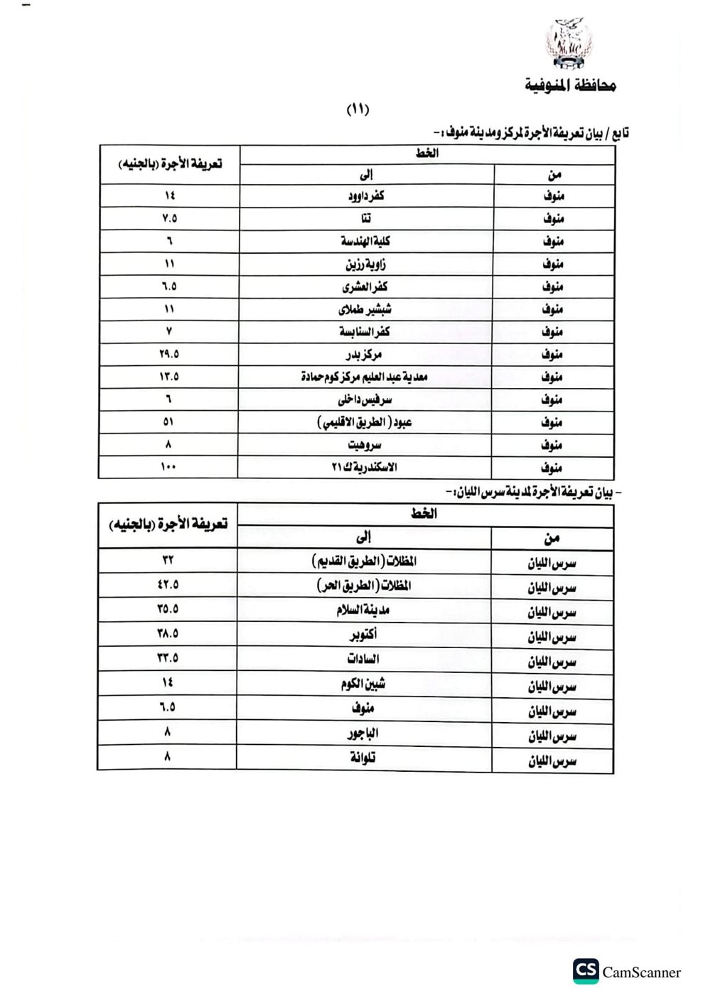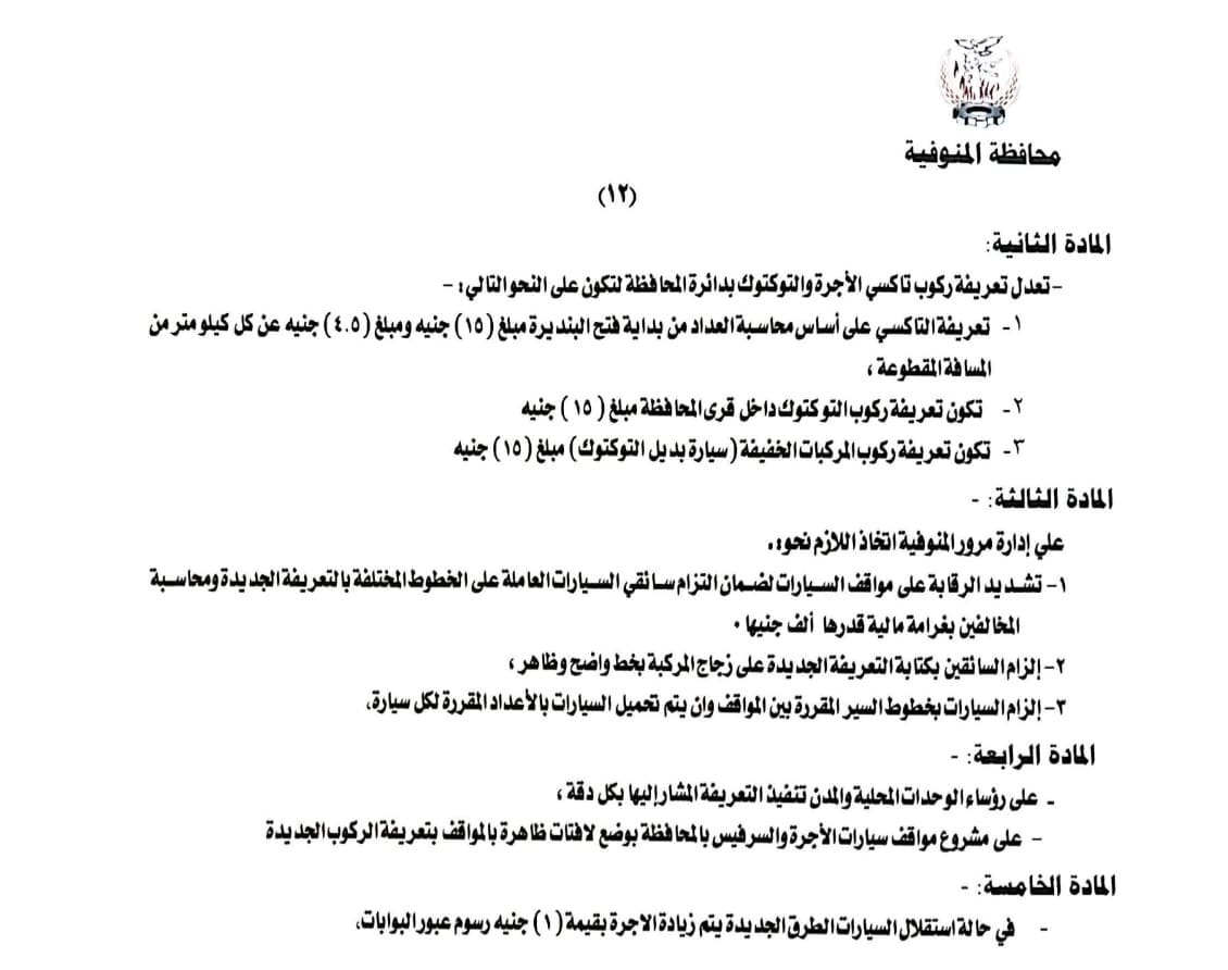 محافظ المنوفية يعتمد تعريفة الركوب الجديدة لسيارات الأجرة والتاكسي بالخطوط الداخلية والخارجية