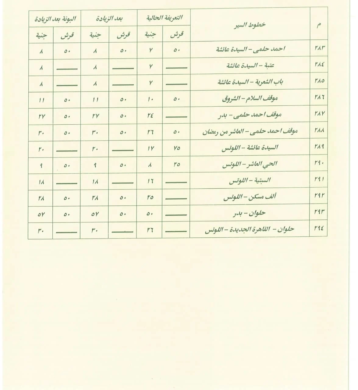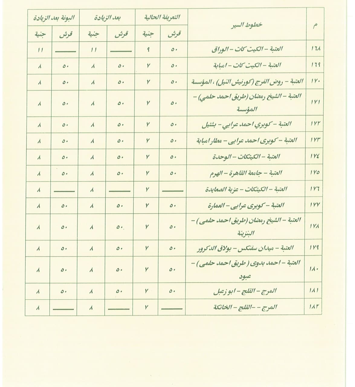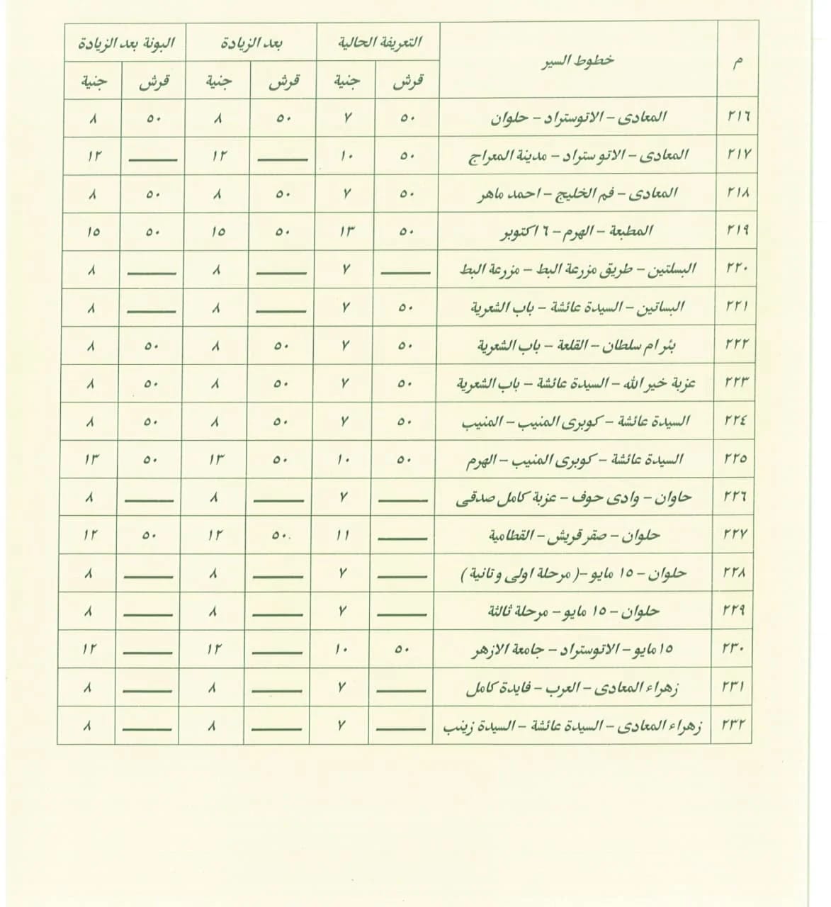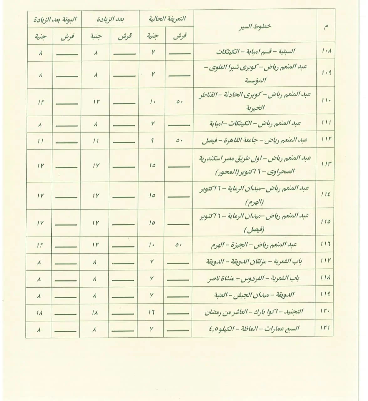 عدلت محافظة القاهرة، تعريفة ركوب سيارات السرفيس، والنقل العام، والنقل الجماعي، والأقاليم، والتاكسي الأبيض، وذلك في ضوء صدور قرار تعديل أسعار بعض المنتجات البترولية وغاز تموين السيارات في ظل الظروف الاستثنائية التي تمر بها أسواق الطاقة عالمياً.