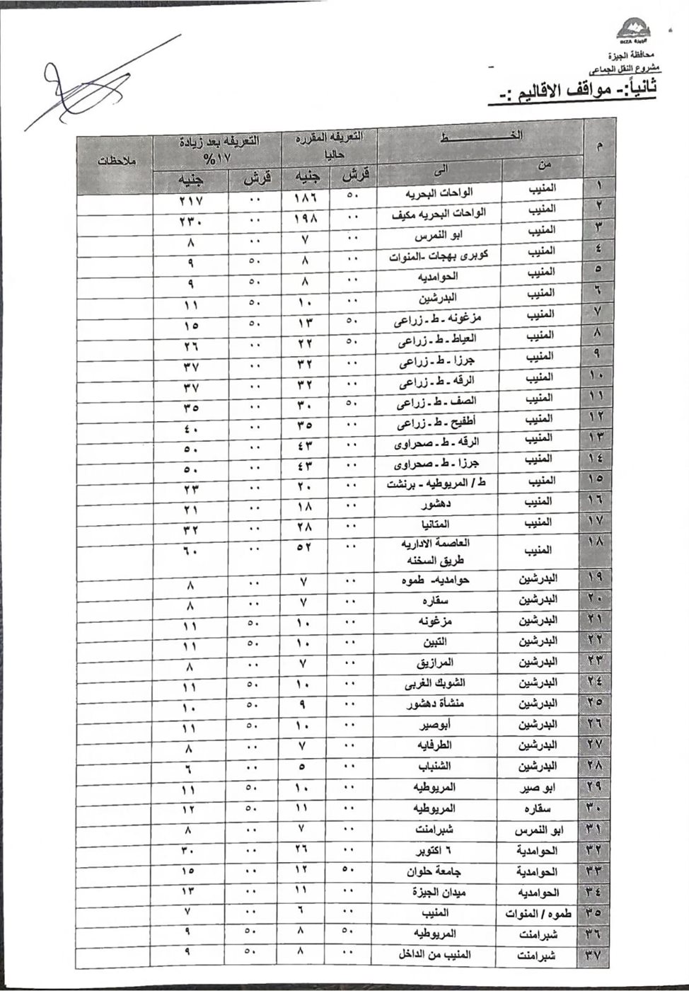 وكلف محافظ الجيزة جهاز السرفيس والأحياء والمراكز بطباعة ملصقات وبانرات بالتعريفة الجديدة والإلتزام بنشرها بالمواقف وتعليقها في مكان واضح للمواطنين والسائقين، مشددًا على ضرورة التأكد من وضع الملصق الخاص بسيارات السرفيس والنقل الجماعي والمتضمن خط السير والأجرة المقررة وفقًا للزيادات الجديدة لعدم قيام قائدى السيارات بزيادة تعريفة الركوب بصورة منفردة أو تقسيم خطوط السير.