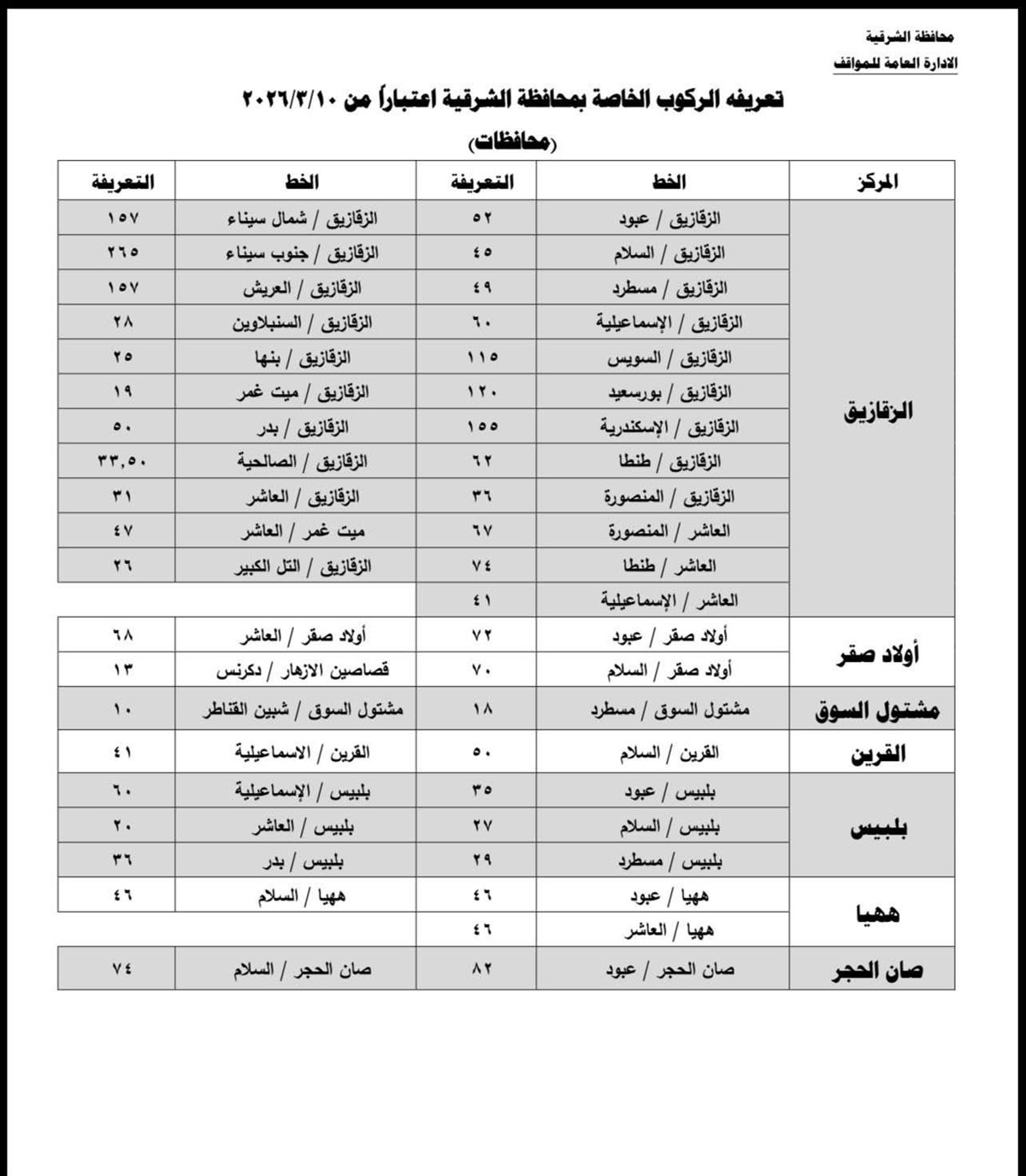 اعتمد المهندس حازم الأشموني محافظ محافظة الشرقية تعريفة الركوب الجديدة لوسائل النقل الداخلي والخارجي، التي تشمل سيارات الميكروباص والسرفيس، وفقًا للجداول المرفقة بمراكز ومدن المحافظة، وذلك عقب قرار لجنة التسعير التلقائي للمنتجات البترولية بتحريك أسعار الوقود اعتبارًا من الساعة السادسة صباح اليوم الثلاثاء 10 مارس 2026.