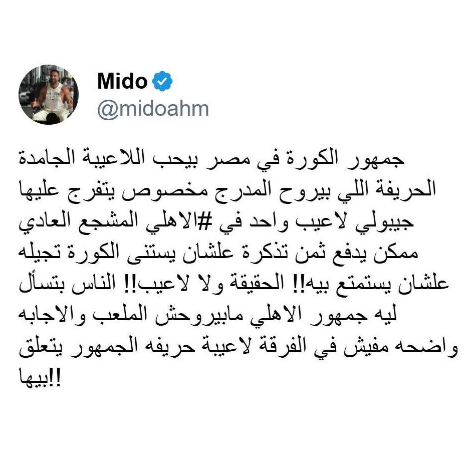 وقال ميدو في منشوره: “جمهور الكورة في مصر بيحب اللاعيبة الجامدة الحريفة اللي بيروح المدرج مخصوص يتفرج عليها جيبولي لاعيب في الاهلي المشجع العادي ممكن يدفع ثمن تذكرة علشان يستنى الكورة تجيله” ، مؤكدًا أن جماهير الأهلي لا تجد في فريقها لاعبين يثيرون هذا الانتماء والشغف، وهو ما يفسر قلة الحضور الجماهيري في المباريات الأخيرة.