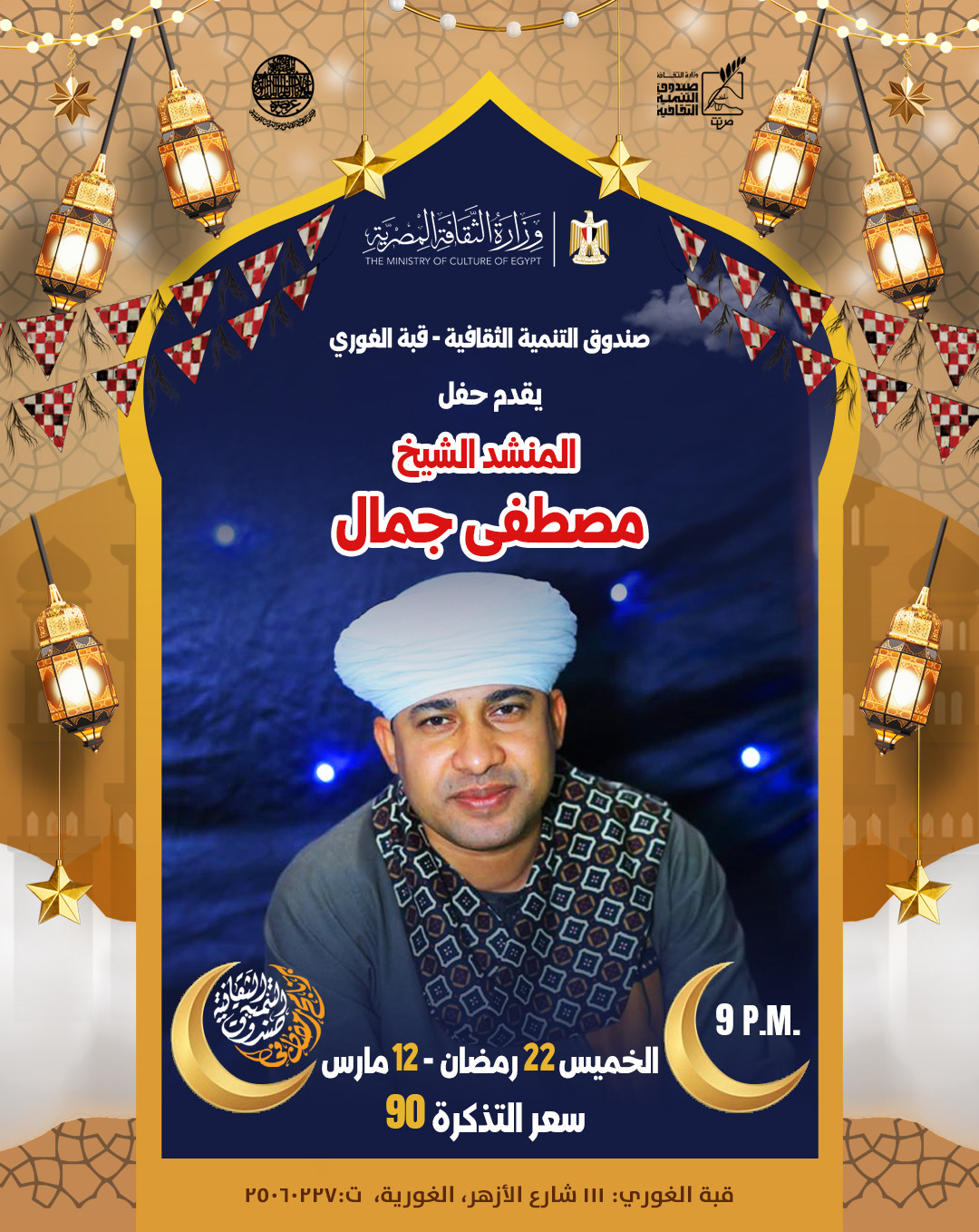 ففي مركز إبداع قبة الغوري يحيي الشيخ المنشد جمال مصطفى أمسية للإنشاد الديني، ويُعد من الأصوات الشابة المميزة في هذا المجال، إذ اشتهر بصوته العذب وأدائه للمدائح النبوية وموالد آل البيت، واكتسب حضورًا واسعًا وشارك في العديد من الاحتفالات الصوفية والرمضانية بمختلف محافظات مصر.