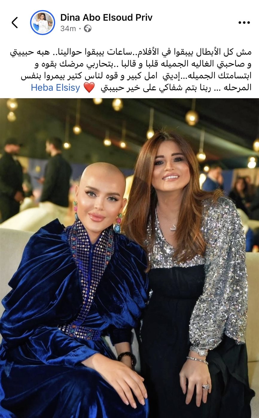 وجهت الإعلامية دينا أبو السعود رسالة دعم مؤثرة لصديقتها الإعلامية هبة السيسي، عقب إعلان إصابتها بمرض السرطان، وذلك من خلال منشور عبر حسابها الشخصي على موقع فيسبوك.