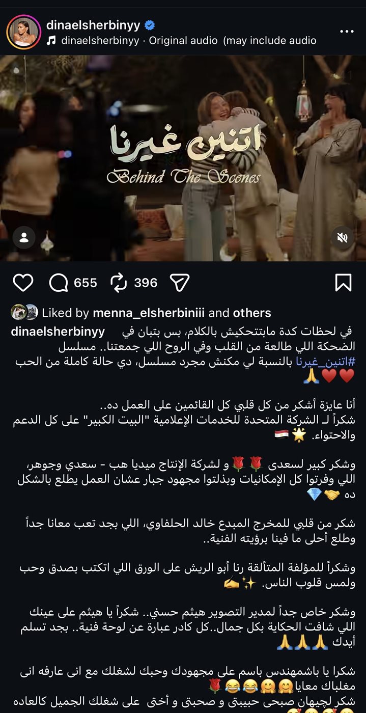 وعبرت دينا الشربيني عبر حسابها الشخصي على تطبيق "إنستجرام" عن أن المسلسل لم يكن مجرد عمل فني بالنسبة لها، بل تجربة مليئة بالمشاعر الحقيقية، مؤكدة: "في لحظات كده ما بتتحكيش بالكلام، بس بتبان في الضحكة اللي طالعة من القلب وفي الروح اللي جمعتنا، مسلسل اتنين غيرنا بالنسبة لي مكنش مجرد مسلسل، دي حالة كاملة من الحب".