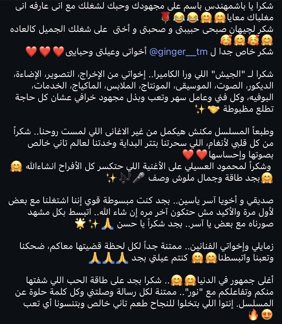 ولم تنس الشربيني الإشادة بالمطربين أنغام ومحمود العسيلي الذين قدما أغاني المسلسل، موضحة أن الأغاني أضفت روحًا خاصة على العمل، واختتمت رسالتها بتوجيه الشكر لجمهورها، معتبرة أن دعمهم وتفاعلهم مع شخصية "نور" هو ما يمنح النجاح طعماً مختلفاً ويجعل كل التعب يهون.