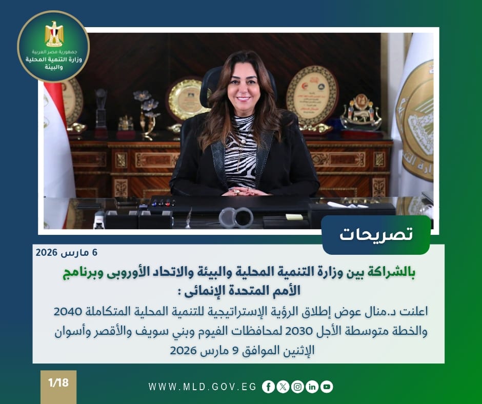 أعلنت الدكتورة منال عوض وزيرة التنمية المحلية والبيئة، عن تنظيم مؤتمر "إطلاق الرؤية الإستراتيجية للتنمية المحلية المتكاملة 2040؛ والخطة متوسطة الأجل حتى عام 2030 لمحافظات الفيوم وبني سويف والأقصر وأسوان"؛ وذلك يوم الاثنين الموافق 9 مارس 2026 برئاسة مشتركة بين الوزارة والاتحاد الأوروبي وبرنامج الأمم المتحدة الإنمائي؛ وبرعاية وزارات التخطيط والتنمية الاقتصادية والخارجية والتعاون الدولى، وبمشاركة وحضور ممثلي وزارت المالية والاستثمار والصناعة وبعض الوزارات المعنية والمحافظين وممثلي المحافظات، والجهات المانحة ومنظمات المجتمع المدني والمستثمرين ذات الصلة في إطار الترويج للفرص الاستثمارية والمشروعات التنموية بكل محافظة؛ وتبنيها من جانب الوزارات والجهات الشريكة على المستوى المركزي والمحلي.