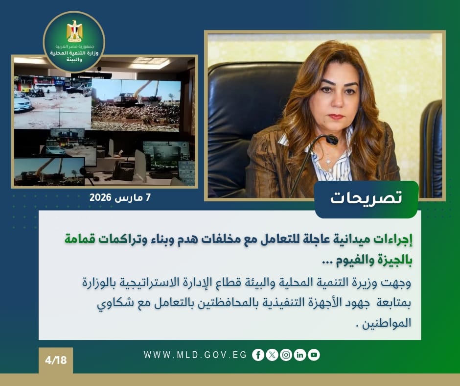 كما تلقت الدكتورة منال عوض وزير التنمية المحلية والبيئة، تقريرًا بشأن ما رصده مركز سيطرة الشبكة الوطنية للطوارئ والسلامة العامة ومركز إدارة الأزمات بالوزارة من صور ومنشورات متداولة عبر بعض منصات التواصل الاجتماعي تشير إلى وجود تجمعات لمخلفات مباني وإشغالات بمنطقة المنيرة التابعة لحي إمبابة بمحافظة الجيزة، بالإضافة إلى استغاثة متداولة من بعض أهالي منطقة عزبة علي عبد العال – زاوية الكرادسة – مركز الفيوم بشأن تراكم كميات من القمامة داخل أحد المجاري المائية بالمنطقة.