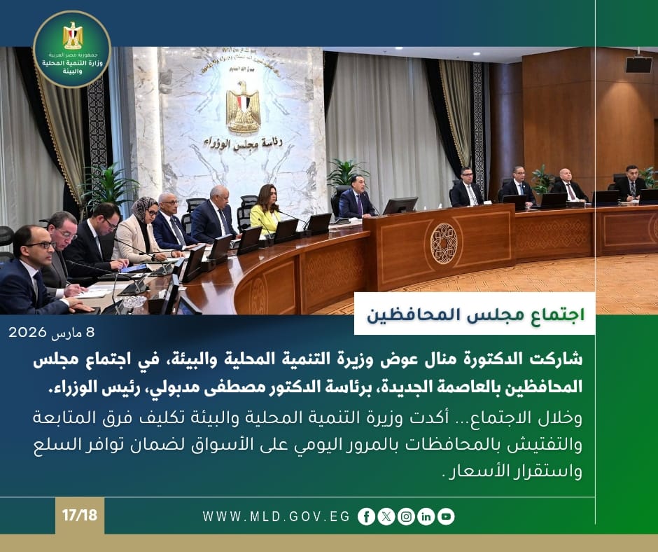 شاركت الدكتورة منال عوض وزيرة التنمية المحلية والبيئة في اجتماع مجلس المحافظين برئاسة الدكتور مصطفى مدبولي رئيس الوزراء بالعاصمة الجديدة، وخلال الاجتماع أكدت الدكتورة منال عوض، أن هناك تكليفات واضحة لإدارات المُتابعة والتفتيش في كل محافظة، بتحرك فرقها الميدانية يومياً لمتابعة الأسواق، للوقوف على حجم توافر السلع اللازمة لاحتياجات المواطنين، وتوازن الأسعار، ورصد أي مُمارسات احتكارية ومواجهتها.