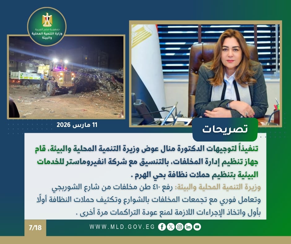 وتنفيذاً لتوجيهات الدكتورة منال عوض وزيرة التنمية المحلية والبيئة، قام جهاز تنظيم إدارة المخلفات، بالتنسيق مع شركة انفيروماستر للخدمات البيئية بتنظيم حملات نظافة بحي الهرم، بالتعاون والتنسيق مع الحي والهيئة العامة للنظافة والتجميل بالجيزة، وذلك في إطار الجهود المستمرة للارتقاء ودعم منظومة النظافة وتحسين مستوى الخدمات المقدمة للمواطنين بمحافظة الجيزة.