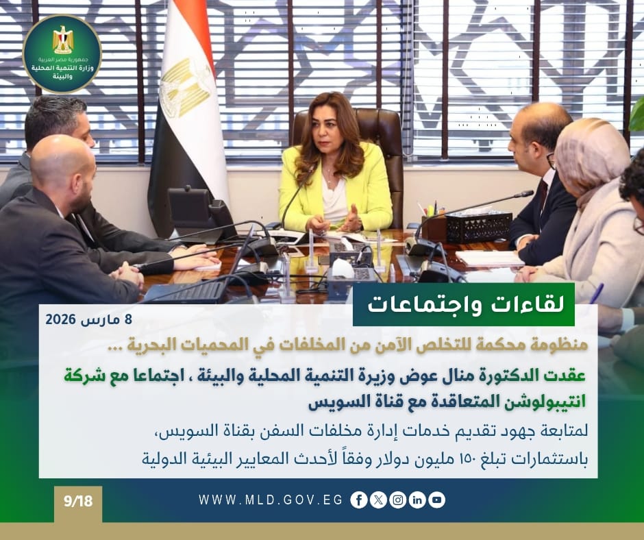 كما عقدت الدكتورة منال عوض وزيرة التنمية المحلية والبيئة، اجتماعا مع شركة انتيبولوشن المتعاقدة مع قناة السويس لتقديم خدمات إدارة مخلفات السفن، باستثمارات تبلغ ١٥٠ مليون دولار وفقاً لأحدث المعايير البيئية الدولية، حيث تم مناقشة إمكانية التعاون في إدارة المخلفات في المحميات البحرية، وذلك بحضور السيد كريتون كاتسامينيس الرئيس التنفيذي للشركة، والسيد عبد الوهاب حافظ المدير المالي بالشركة والأستاذ ياسر عبد الله رئيس جهاز تنظيم إدارة المخلفات.
