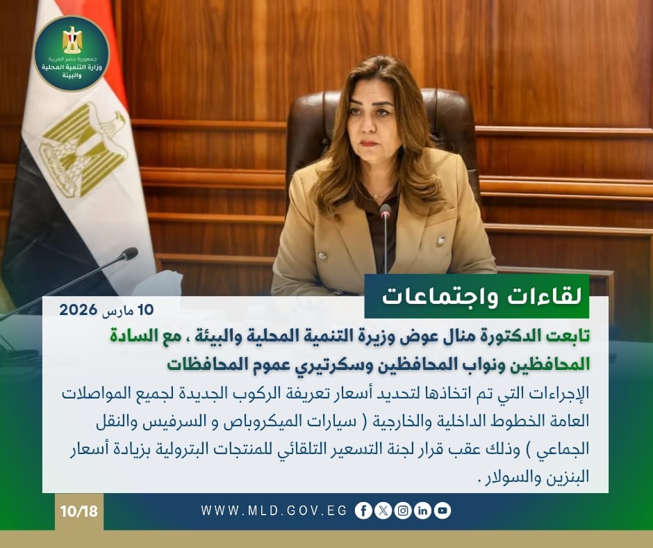 تابعت الدكتورة منال عوض وزيرة التنمية المحلية والبيئة، مع المحافظين ونواب المحافظين وسكرتيري عموم المحافظات الإجراءات التي تم اتخاذها لتحديد أسعار تعريفة الركوب الجديدة لجميع المواصلات العامة الخطوط الداخلية والخارجية ( سيارات الميكروباص والسرفيس والنقل الجماعي ) وذلك عقب قرار لجنة التسعير التلقائي للمنتجات البترولية بزيادة أسعار البنزين والسولار .