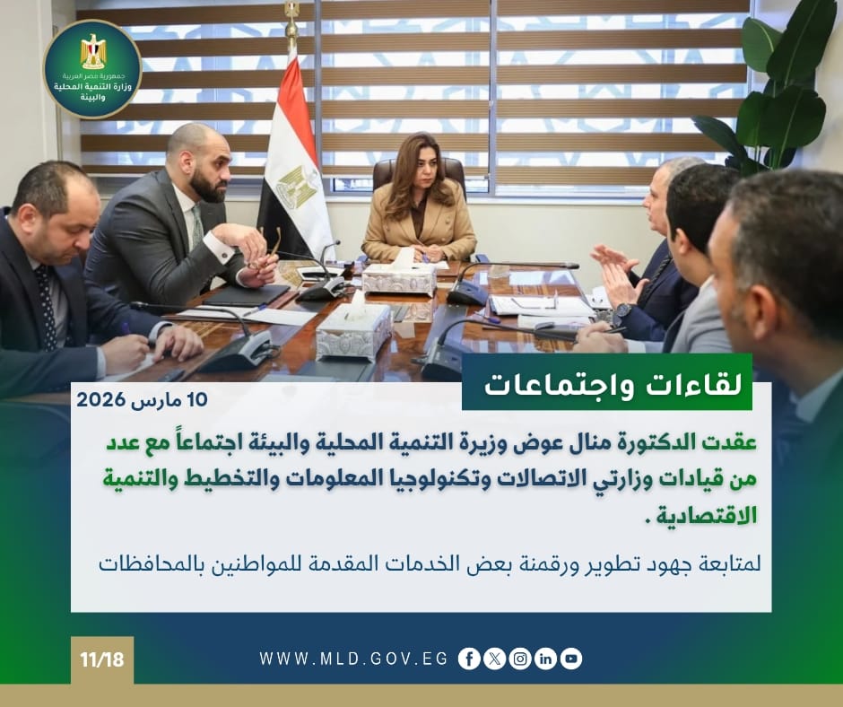 وعقدت الدكتورة منال عوض وزيرة التنمية المحلية و البيئة اجتماعاً مع عدد من قيادات وزارتي الاتصالات وتكنولوجيا المعلومات والتخطيط والتنمية الاقتصادية ، لاستعراض آخر المستجدات الخاصة بخطوات تيسير وتبسيط إجراءات إصدار تراخيص المحال العامة والتجارية والأنشطة المختلفة، ومتابعة جهود تطوير ورقمنة بعض الخدمات المقدمة للمواطنين بالمحافظات.