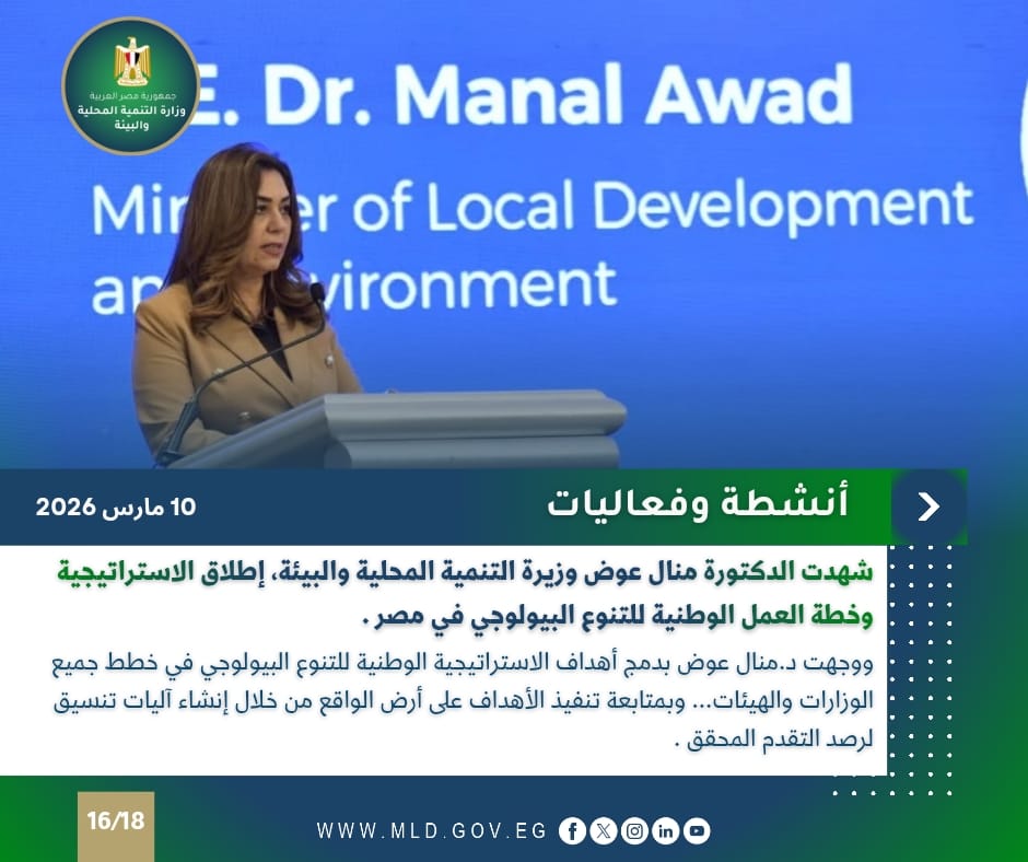كما شهدت الدكتورة منال عوض وزيرة التنمية المحلية والبيئة، إطلاق الاستراتيجية وخطة العمل الوطنية للتنوع البيولوجي في مصر، وذلك في إطار جهود الوزارة لتعزيز صون التنوع البيولوجي وحماية الموارد الطبيعية، ووضع أسس واضحة للإدارة المستدامة للثروات الطبيعية لنا وللأجيال القادمة، مؤكدة أن إطلاق الاستراتيجية يمثل خطوة مهمة نحو تعزيز منظومة العمل البيئي في مصر، ويجسد الشراكة الوطنية الحقيقية بين مختلف الجهات المعنية، كما يترجم رؤية القيادة السياسية بقيادة الرئيس عبد الفتاح السيسي للحفاظ على الموارد الطبيعية وتحقيق التنمية المستدامة.