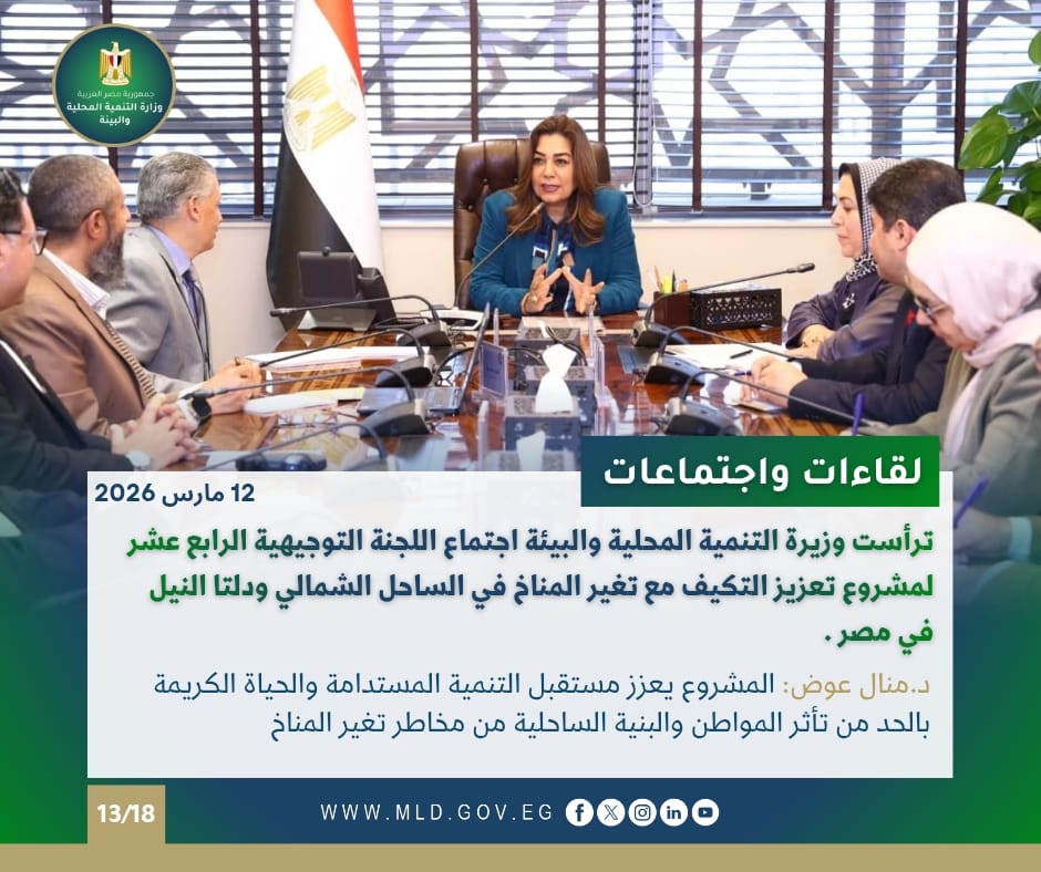 وترأست الدكتورة منال عوض وزيرة التنمية المحلية والبيئة اجتماع اللجنة التوجيهية الرابع عشر لمشروع تعزيز التكيف مع تغير المناخ في الساحل الشمالي ودلتا النيل في مصر، بحضور عدد من القيادات .