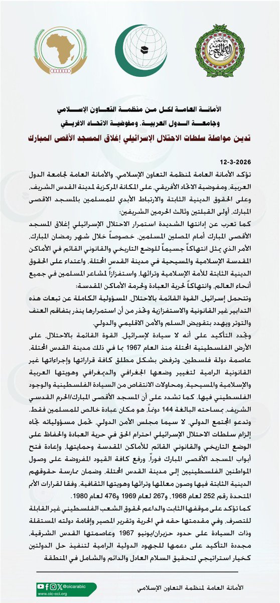 تؤكد الأمانة العامة لمنظمة التعاون الإسلامي، والأمانة العامة لجامعة الدول العربية، ومفوضية الاتحاد الأفريقي على المكانة المركزية لمدينة القدس الشريف وعلى الحقوق الدينية الثابتة والارتباط الأبدي للمسلمين بالمسجد الاقصى المبارك، أولى القبلتين وثالث الحرمين الشريفين عن إدانتها الشديدة لاستمرار الاحتلال الإسرائيلي إغلاق المسجد الأقصى المبارك أمام المصلين المسلمين خصوصاً خلال شهر رمضان المبارك، الأمر الذي يمثل انتهاكاً جسيما للوضع التاريخي والقانوني القائم في الأماكن المقدسة الإسلامية والمسيحية في مدينة القدس المحتلة، واعتداء على الحقوق الدينية الثابتة للأمة الإسلامية وتراثها، واستفزازا المشاعر المسلمين في جميع أنحاء العالم، وانتهاكا لحرية العبادة والحرمة للأماكن المقدسة.
