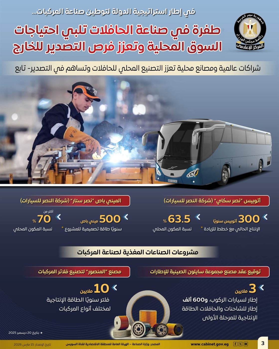 نشر المركز الإعلامي لمجلس الوزراء عددًا من الإنفوجرافات عبر منصاته الرسمية على مواقع التواصل الاجتماعي، سلطت الضوء على ما شهدته صناعة الحافلات من طفرة أسهمت في تلبية احتياجات السوق المحلي، والانطلاق بقوة نحو التصدير، وذلك في إطار استراتيجية الدولة لتوطين صناعة المركبات وتعميق التصنيع المحلي.