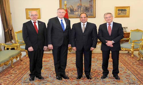 وصرح السفير علاء يوسف المُتحدث الرسمي باسم رئاسة الجمهورية بأن الرئيس رحب بنائب رئيس البرلمان الألماني، وطلب نقل تحياته إلى المستشارة الألمانية "أنجيلا ميركل"، مشيداً بالزخم المتنامي في العلاقات المصرية الألمانية، واللقاءات المتعددة التي عقدها سيادته مع المستشارة الألمانية على مدار العامين الماضيين. وأشار الرئيس إلى حرص مصر على الدفع قدماً بالتعاون مع ألمانيا في مختلف المجالات، ولاسيما علي صعيد تعزيز التواصل والتعاون البرلماني، بالإضافة إلى زيادة التعاون الاقتصادي والتدريب الفني، مثمناً في هذا الإطار مساهمة الشركات الألمانية في العديد من المشروعات التنموية التي تُنفذها مصر واستفادتها مما يتوافر بها من فرص استثمارية واعدة، ومنوهاً إلى ما اثبتته هذه الشركات خلال عملها بالمشروعات المصرية من كفاءة ودقة وسرعة في الإنجاز تدعو للإعجاب والتقدير وتعكس الشخصية الألمانية التي تتسم بالجدية والانضباط وتقديس قيمة العمل.