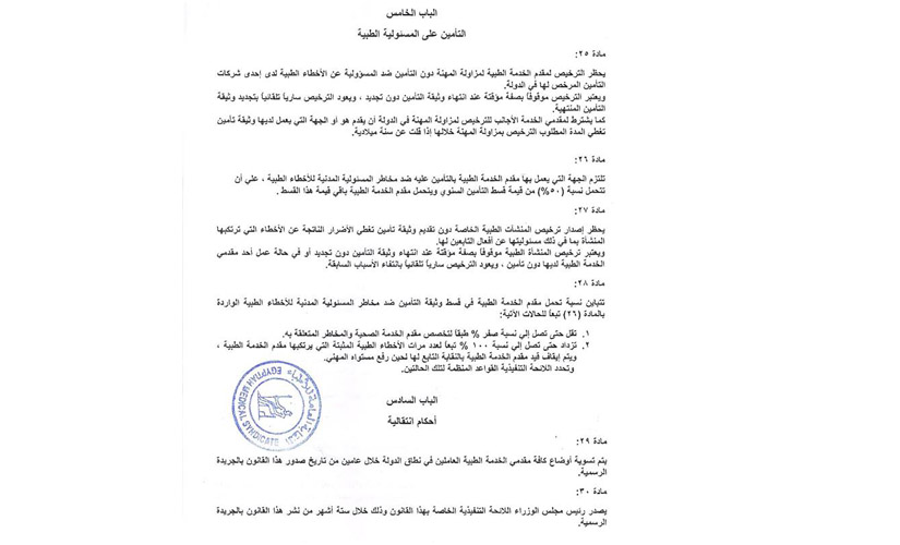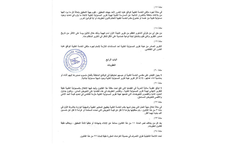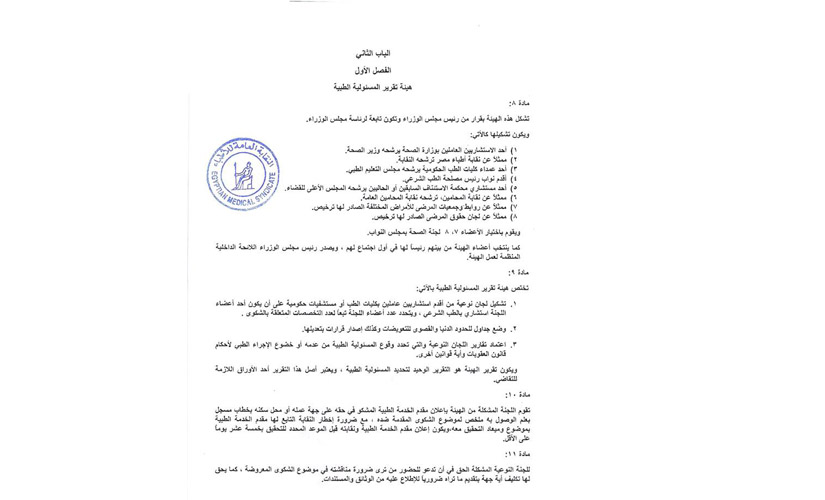 وبمناسبة بدء مناقشة مجلس النواب لمشروع قانون المسؤولية الطبية، يعيد مجلس النقابة نشر نص المشروع الذي قدم لمجلس النواب.
