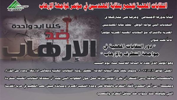 تعقد نقابة المهندسين المصرية بالاشتراك مع النقابات المهنية المصرية مؤتمرًا عامًا تحت عنوان "دور النقابات المهنية في مواجهة التطرف والإرهاب" في تمام الخامسة مساء يوم السبت المقبل الموافق 2/12/2017، بمقر النقابة العامة، بحضور رؤساء النقابات المهنية ومجالس إداراتها، وعدد من الوزراء والشخصيات العامة.