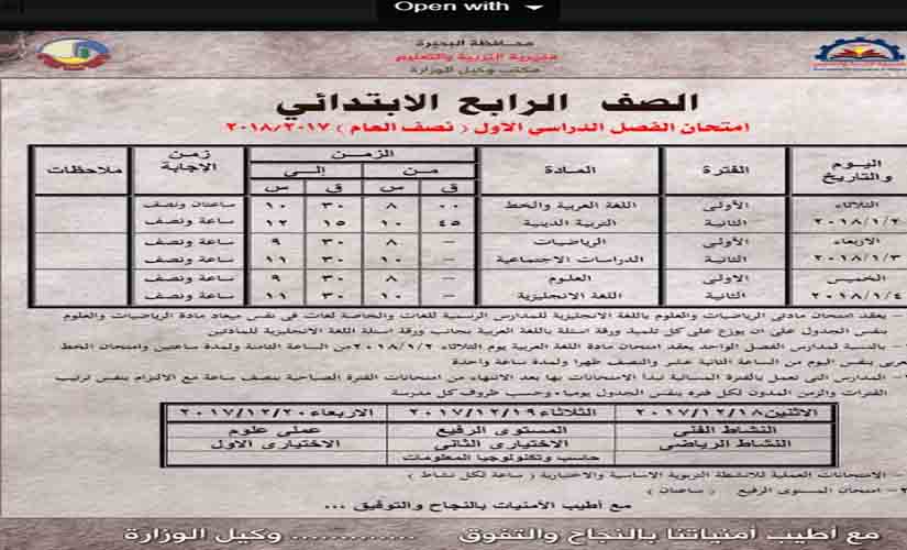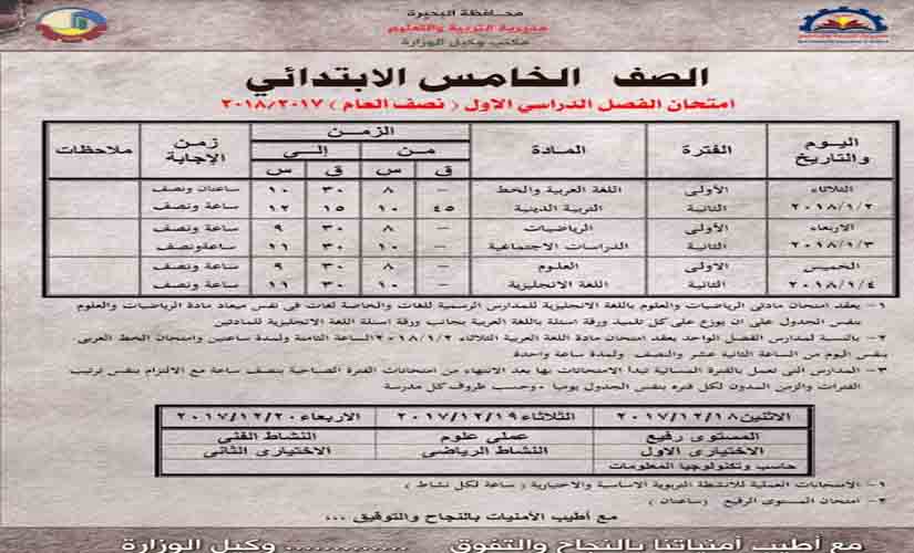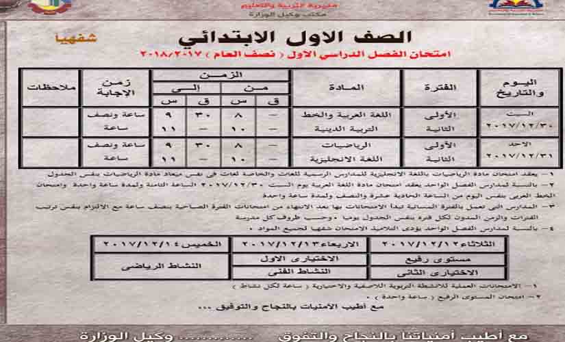 محافظات ننشر جدول امتحانات نصف العام للمرحلة الابتدائية ننشر جدول امتحانات نصف العام للمرحلة الابتدائية الأحد 03/ديسمبر/2017 - 02:18 م 12/3/2017 2:18:00 PM البحيرة - محمد البربرى تنشر "بوابة روزاليوسف" جداول امتحانات نصف العام للمرحلة الابتدائية. # التعليم # امتحانات