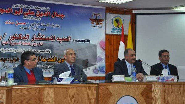 حضر الندوة الدكتور حسن سند عميد كلية الحقوق بالجامعة، والمستشار طه سعيد، والمستشار عبد الناصر إبراهيم رئيسى محكمة القضاء الإداري بالمنيا، وعددًا من مديرى الإدارات والإداريين والموظفين وأعضاء هيئة التدريس بالجامعة.