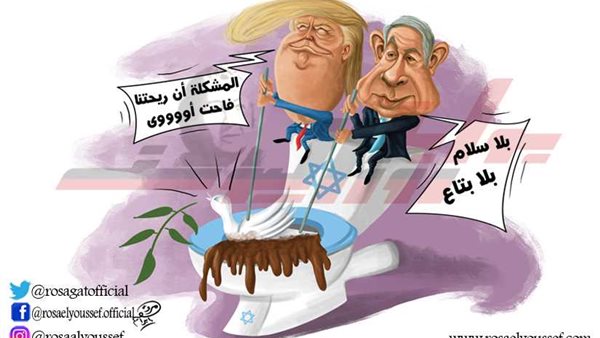 تناول الرسام الساخر لبوابة روزاليوسف الأزمة التي تسبب فيها قرار "ترامب" بنقل السفارة الأمريكية للقدس، بعنوان نتنياهو لترامب:(بلا سلام بلا بتاع)
